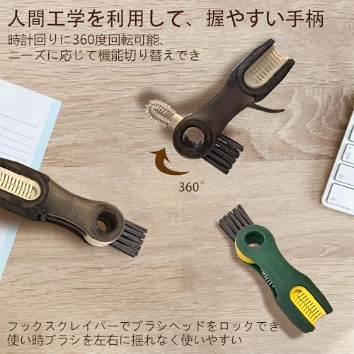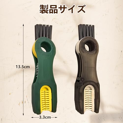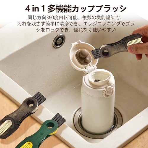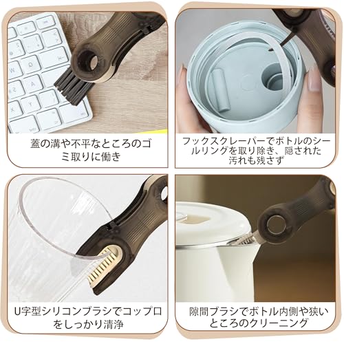 商品説明:いつでもどこでも清潔を保ちたい方へ。本品は多機能デザインの水筒ブラシで、あらゆる水筒・ボトルの洗浄を徹底サポートします。色は人気の黒・緑色でお好みにより選べます。コップ、ボトルも、付着した汚れやシミを簡単に落とすことが可能です。ブラシ本体は柔軟性に優れたナイロン素材を採用しており、ボトルの溝や凸凹不平なところにもしっかり清浄できます。多機能設計ヘッドで、ニーズにより切り替え、届きにくい狭いところの汚れも楽々清浄できます。主な特徴:多機能ヘッド設計: a. フックスクレーパーでボトルのシールリングを取り除き、隠された汚れも残さず。b.U字型ブラシでカップの口に合わせて、カップ周りの頑固な汚れを除去。 c. 隙間ブラシを使ってふたの内側の狭い溝を掃除。 d. 角毛ブラシで容器の角の溝の汚れを取り除きます。隙間ケアに役たち: 360度回転できる機能でニーズによりブラシを自由に切り替え、ステム部分や蓋のパッキン溝などの狭い隙間の汚れを効果的にかき出します。ボトル全体の衛生管理を徹底したい方に最適。高品質素材: 耐熱性・耐摩耗性に優れた素材を使用。繰り返し使用しても変形や劣化が少なく、長期間清潔にご利用いただけます。ハンドル部分は滑り止め加工で握りやすく、洗剤がついた状態でも安定した操作を実現。洗浄力と保護を両立: 強力な洗浄力を発揮しながらも、ボトル内面(ステンレス・ガラス・プラスチックなど)を傷つけにくい配慮された設計です。大切なマイボトルの美観と機能を維持しますコンパクト収納: 使用後は水切りが良く、清潔を保ちながら省スペースで収納可能。キッチンやアウトドア、オフィスなど、あらゆるシーンで便利にご活用ください。このブラシは、水筒やマグカップ、ストロー付きボトル、ペットボトルなど、様々な容器の日々のお手入れに。忙しい毎日でも、手軽で確実な洗浄を実現し、清潔で快適なドリンクライフをお約束します。それに溝や隙間、凹凸不平なところの掃除に楽々!