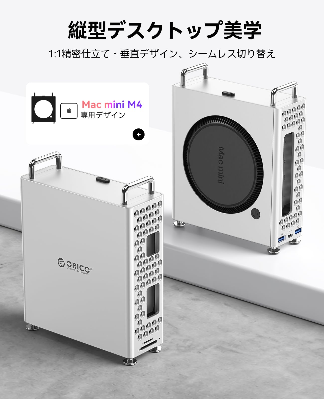 ORICO MiniPro アルミMac mini M4スタンドドック、5-IN-1 USB-Cハブ10Gbps高速転送、内蔵ソフトシリコンライナー、工具不要設置、Mac Mini M4/M4 Proアクセサリー (MS10-5P)