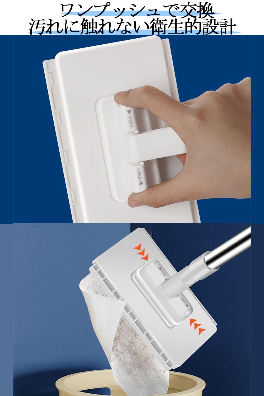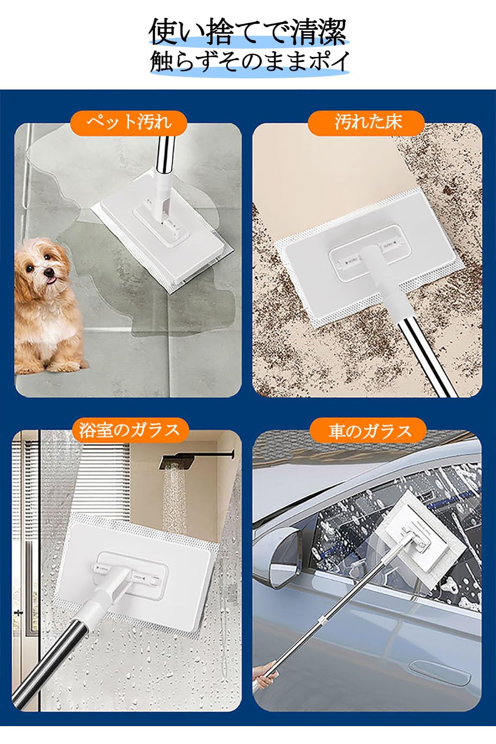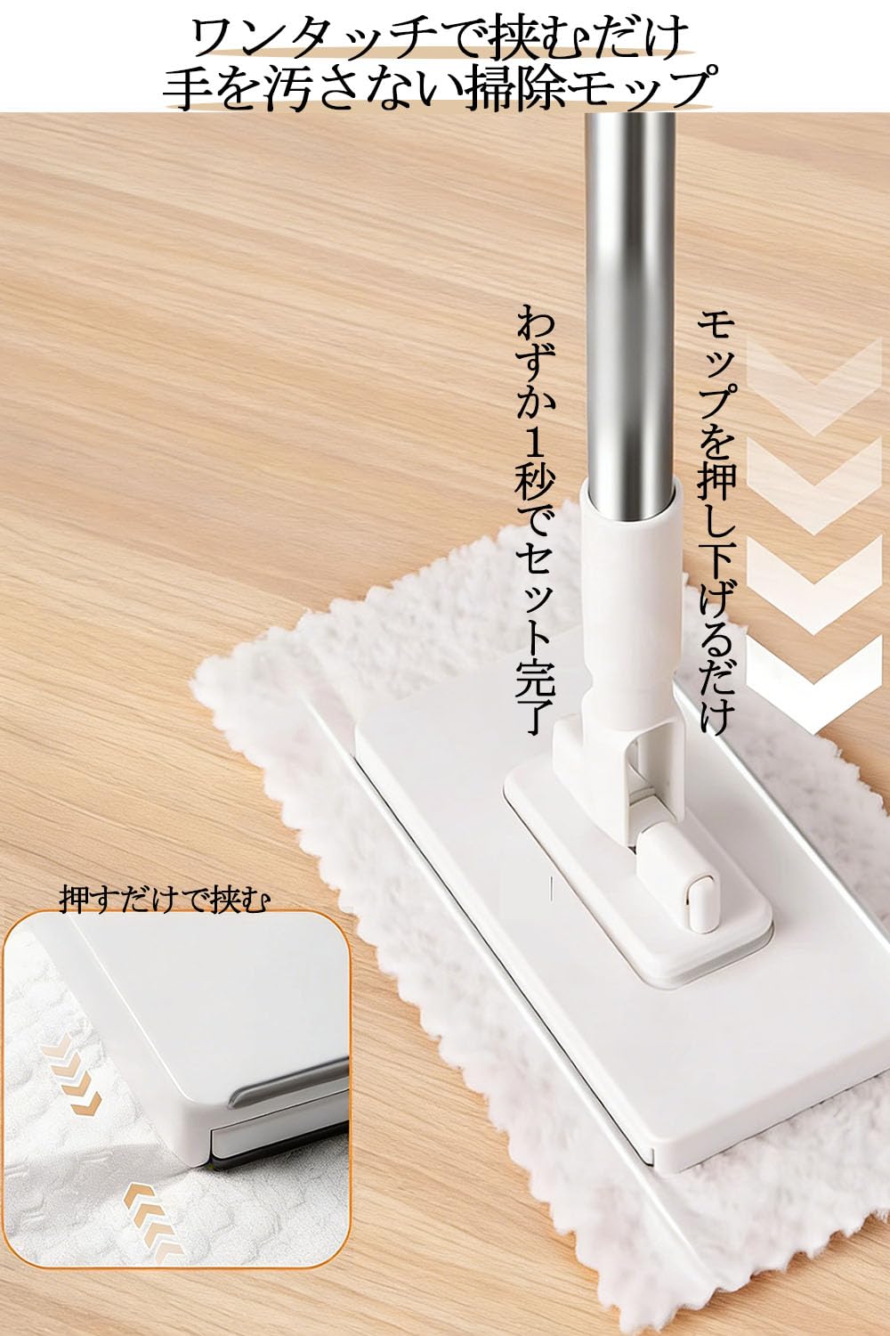 JetWave モップ 乾湿両用 ワンタッチ式 自動雑巾挟み 3段伸縮ポール 長さ調節可 ベランダ 玄関 床 フローリング対応 掃除道具