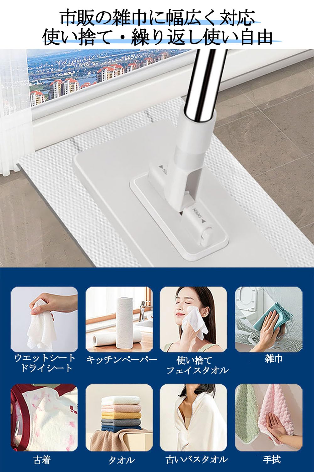 [NIJITUKI] フロアワイパー 本体 1秒で着脱 ワンタッチモップ フロアモップ 拭き掃除 雑巾ワイパー 水拭きモップ 乾湿両用 ベランダ 玄関 床 窓 フロア フローリング 掃除道具 モップ 汚れ・ほこり・髪の毛対応 ドライパッド[ランダムスタイル]1枚入 (ホワイト)