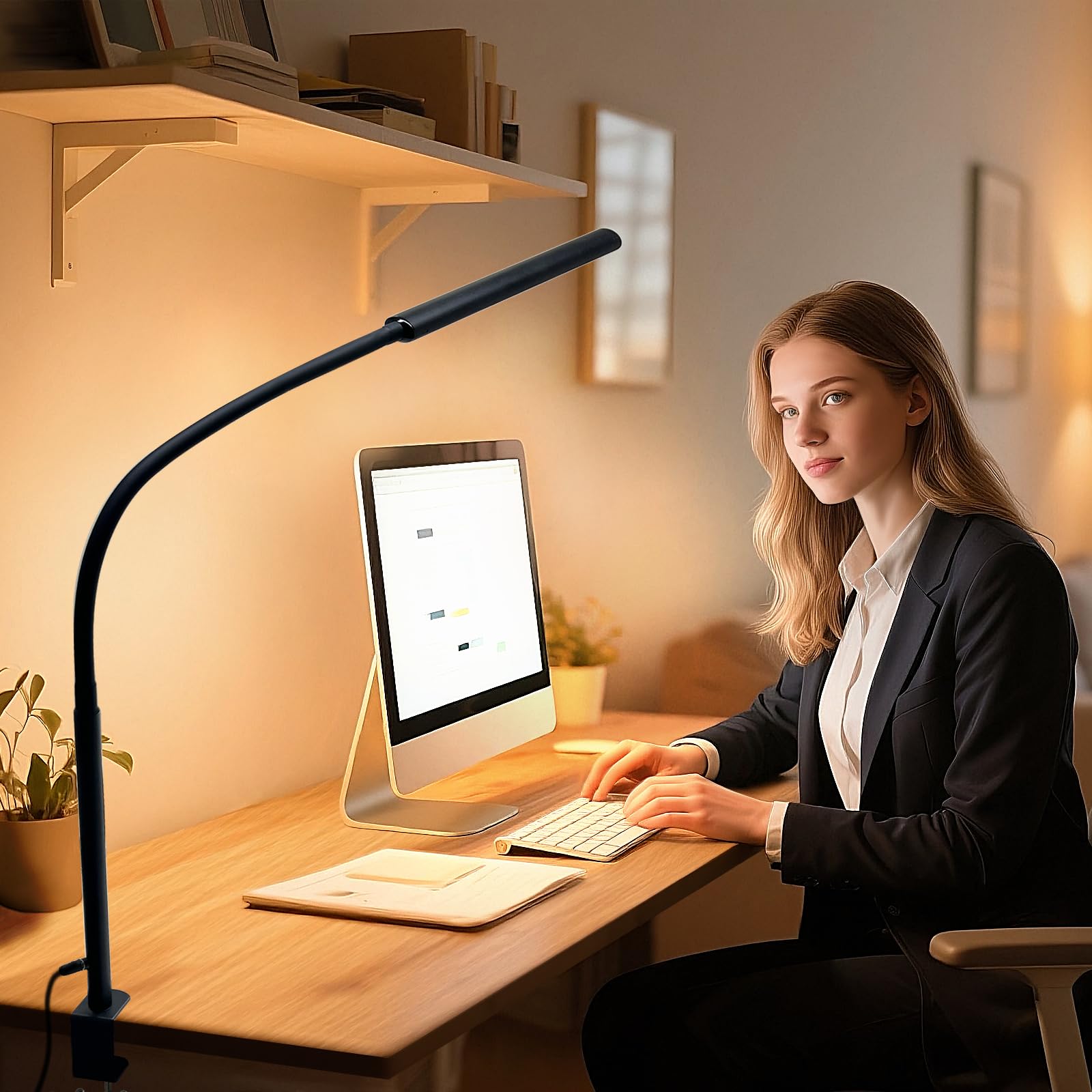 オフィス用 LED デスク ランプ、目に優しいデスク ライト、3 つのカラー モード、10 段階の明るさ、調整可能なフレキシブル グースネックと格納式ポール、読書、勉強、作業台用クランプ付き 18W USB デスク ランプ (ブラック)