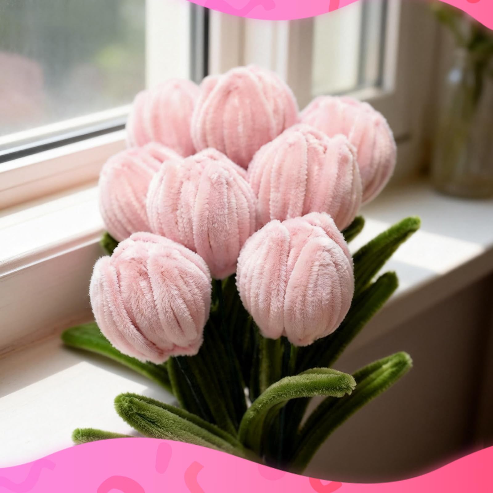手芸モール ピンク色*100本+緑色*100本 造花 チューリップ 花束 手作りキット お花 モールアート ワイヤーアート 手芸素材 工作モール 人工花茎とフラワーテープ付き 記念日/誕生日/母の日/バレンタインデー 贈り物 DIY手作り用