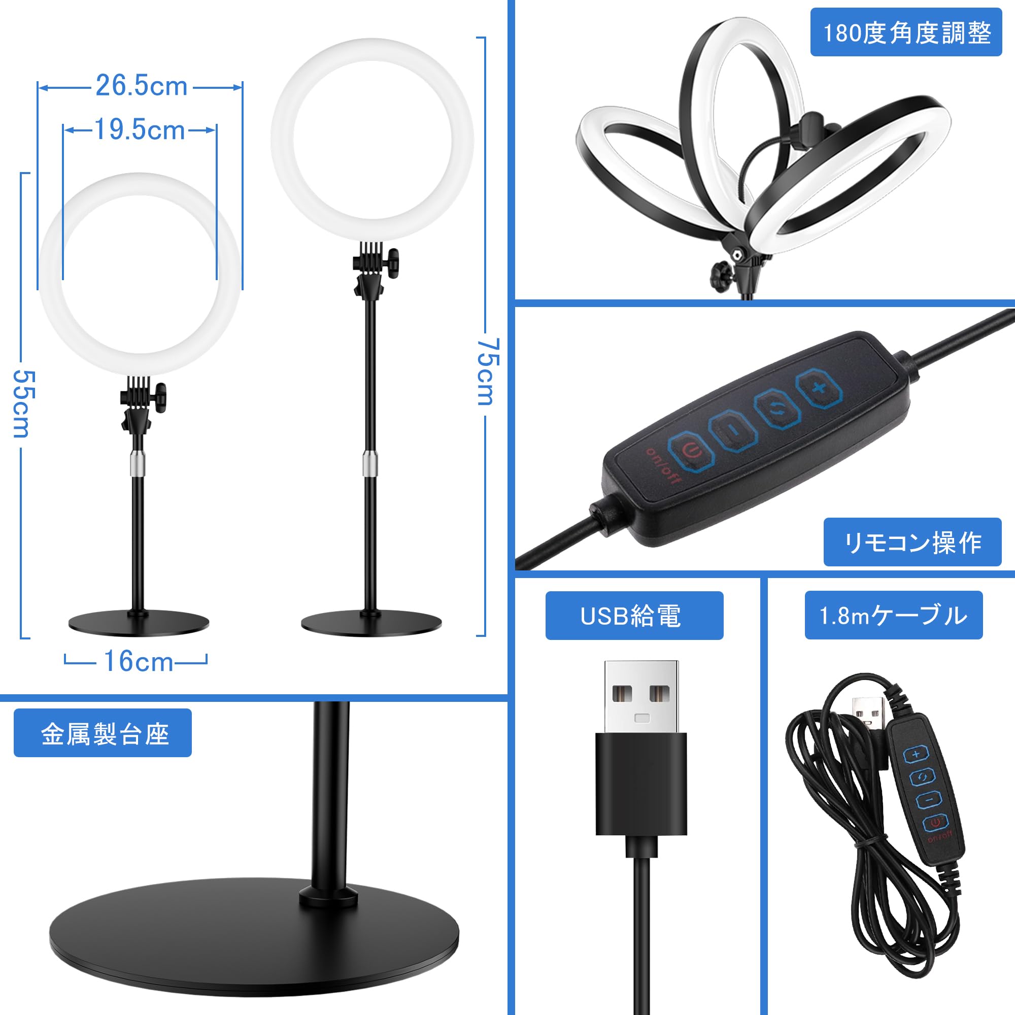 リングライト 6インチ 三脚スタンド デスク用 クリップ式 強光 色温度調整 リモコン操作可能 補光 撮影 角度自由調整 USB給電対応 配信・美容・自撮りに最適