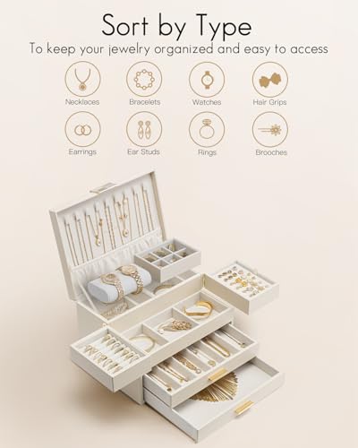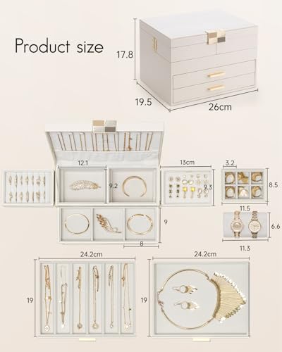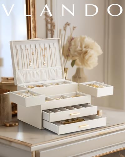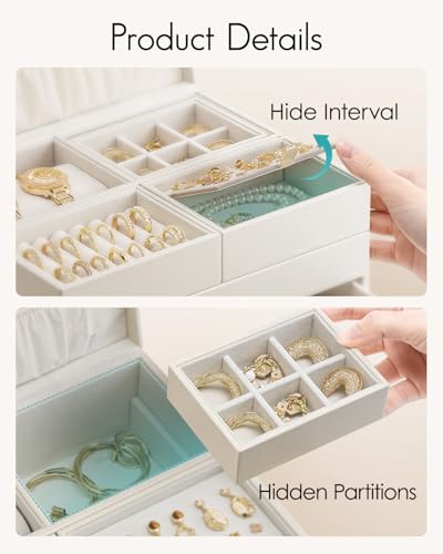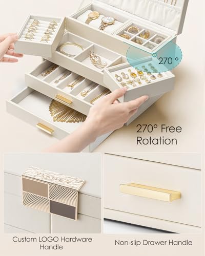 Vlando ジュエリーボックス 収納 アクセサリーケース 大容量の高級宝石箱 プレゼント メイクボックス ミラー 鏡付き ピアス ネックレス 指輪 リング アクセサリー 指輪置き ジュエリーバッグ (オフホワイト)
