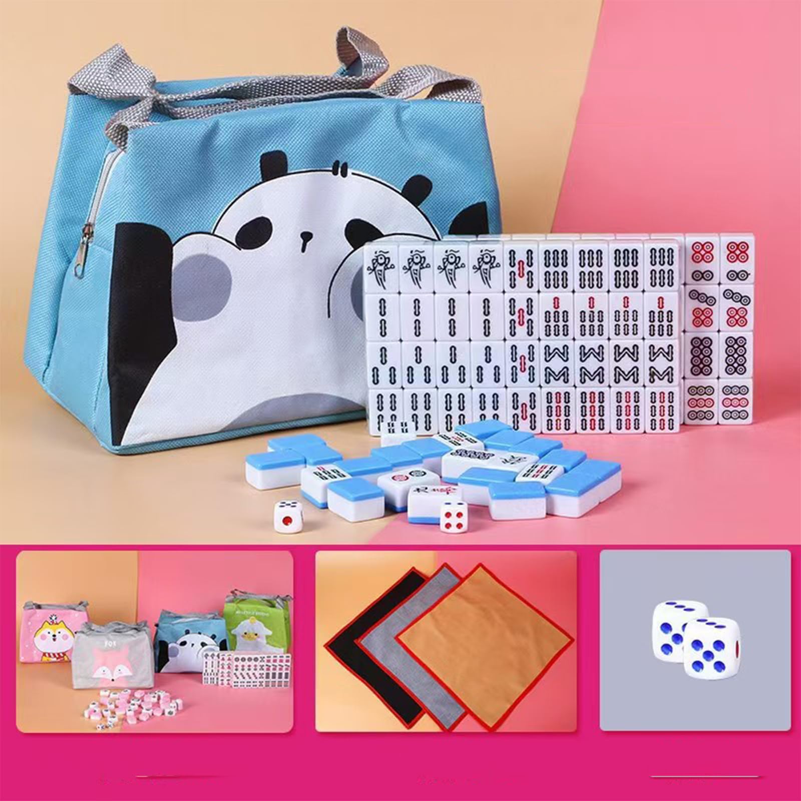 麻雀牌 麻雀セット 144枚 収納バッグ付き 麻雀マット付き 超軽量 麻雀パイ 携帯便利 ポータブル 家庭 旅行用 初心者 ミニ 持ち運び便利 サイコロ2個 樹脂材質 おもちゃ 24*16*12mm ピンク
