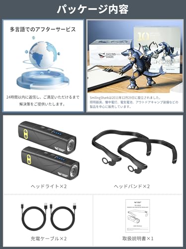 Smiling Shark 充電式 LED ヘッドライト, 【最新款・PSE认证・白光1個セット】 USB充電可能 3 倍高輝度アウトドアヘッドランプ 230°広角照明 集光 超軽量 IPX4 防水防塵 8時間連続使用可能 キャンプ 登山 散歩 釣り 作業 停電用 防災用 最適