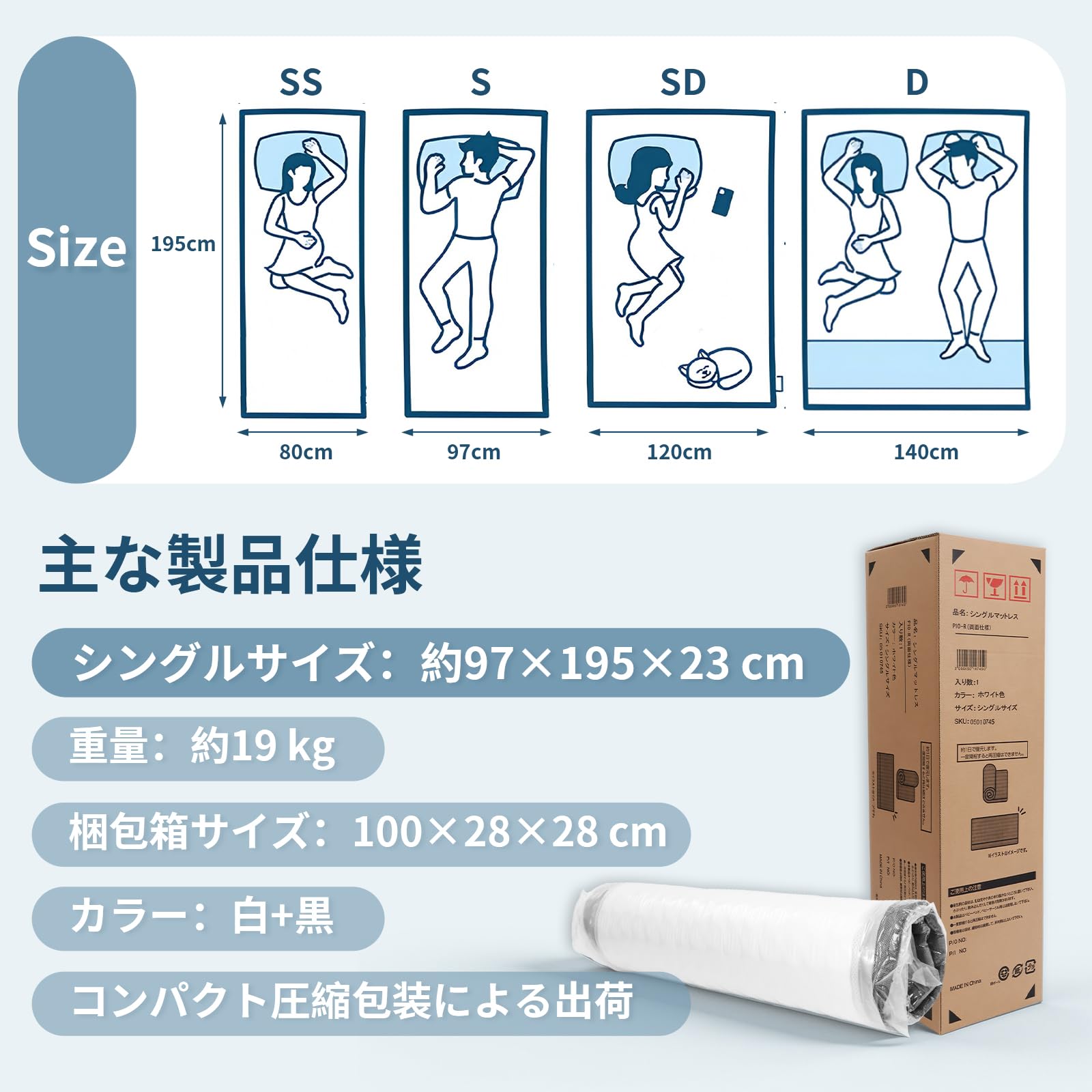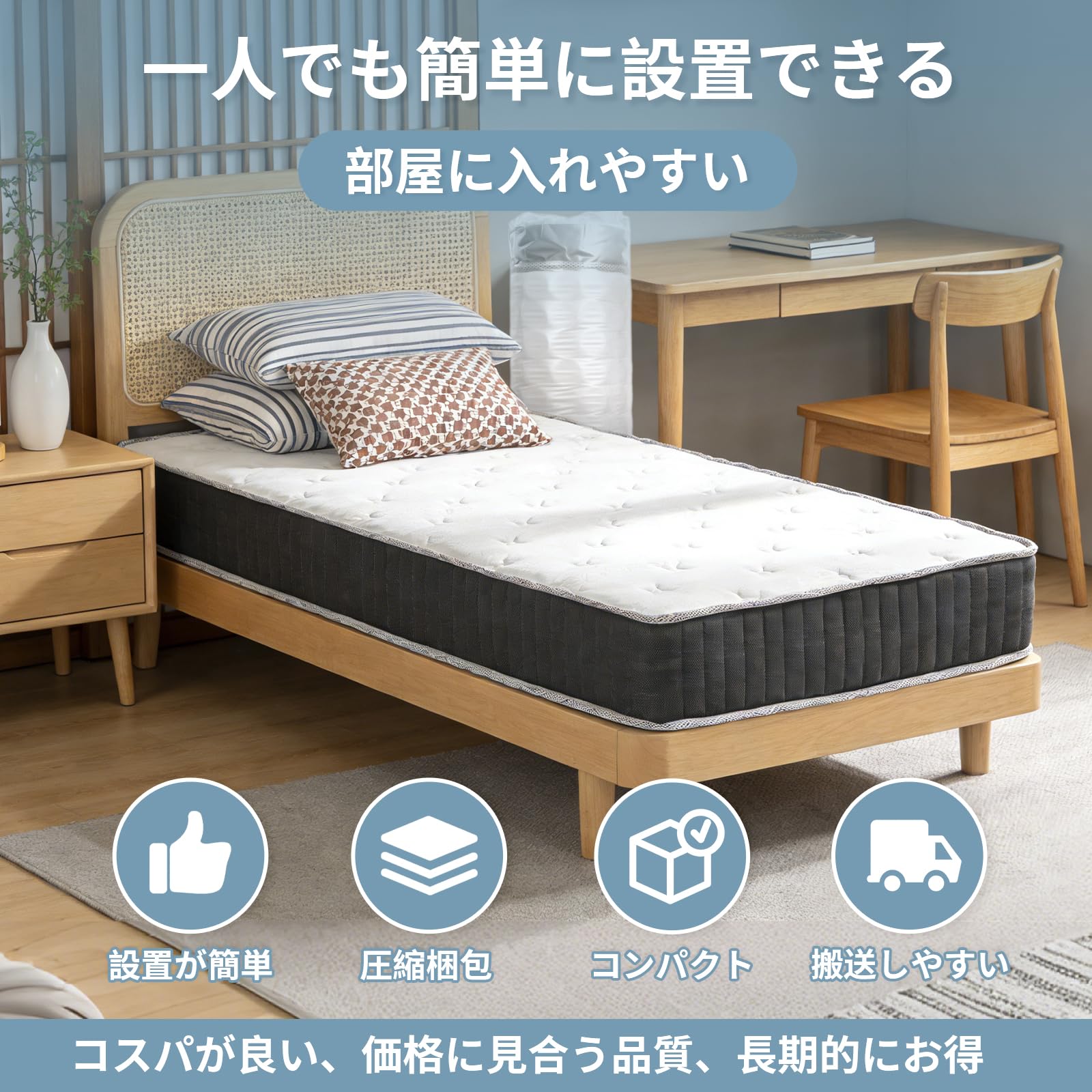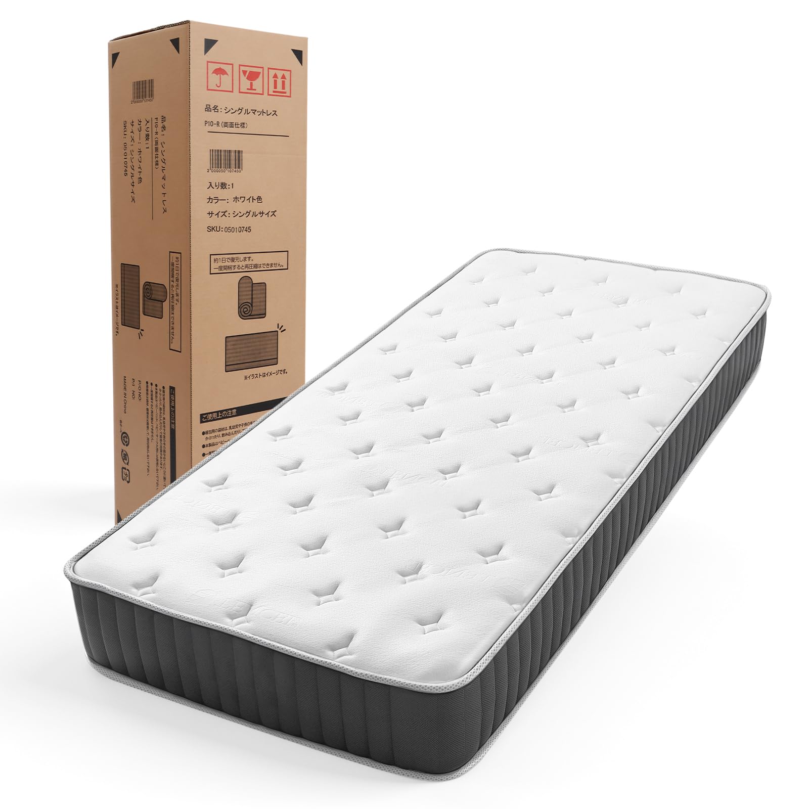 白雲海·マットレス シングル 極厚23cm 線径2.1mm 高密度独立袋装コイル 高密度ウレタン 体圧分散 高耐久 通気性 静音 | 圧縮梱包