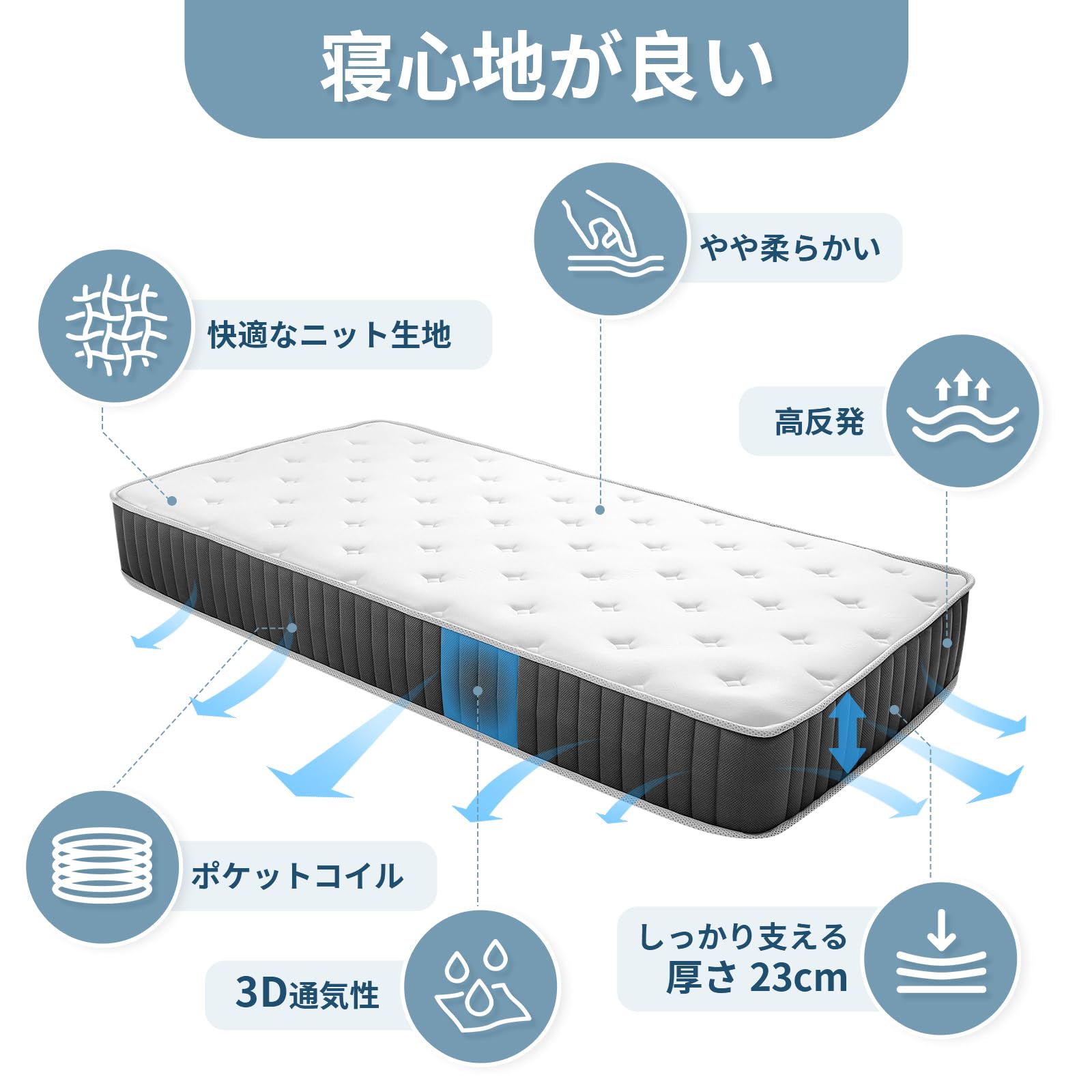 MOLPHIT マットレス セミダブル 厚さ23CM ポケットコイル 高反発 セミダブル ベッドマットレス 硬め 体圧分散 通気性 圧縮配送
