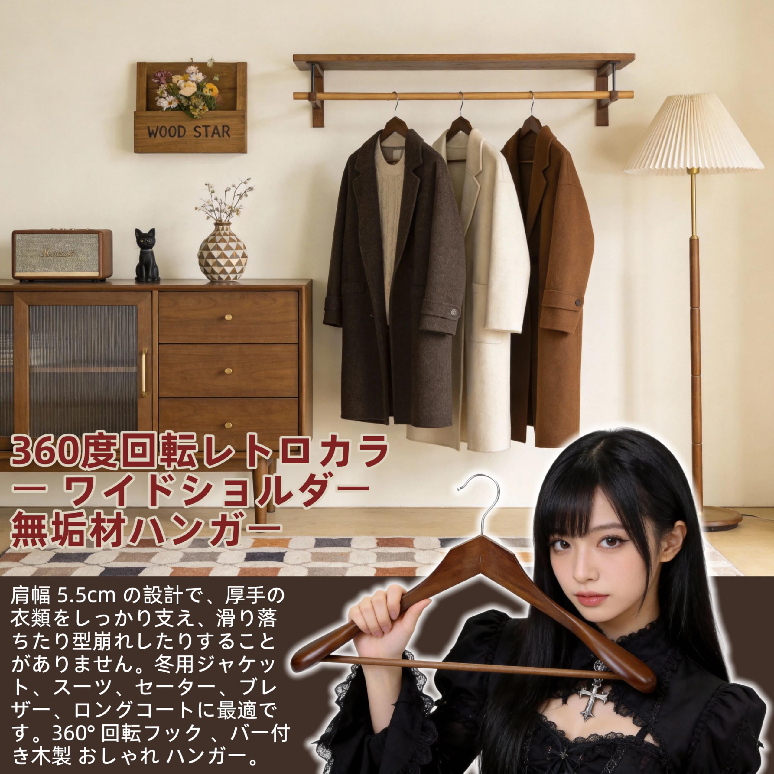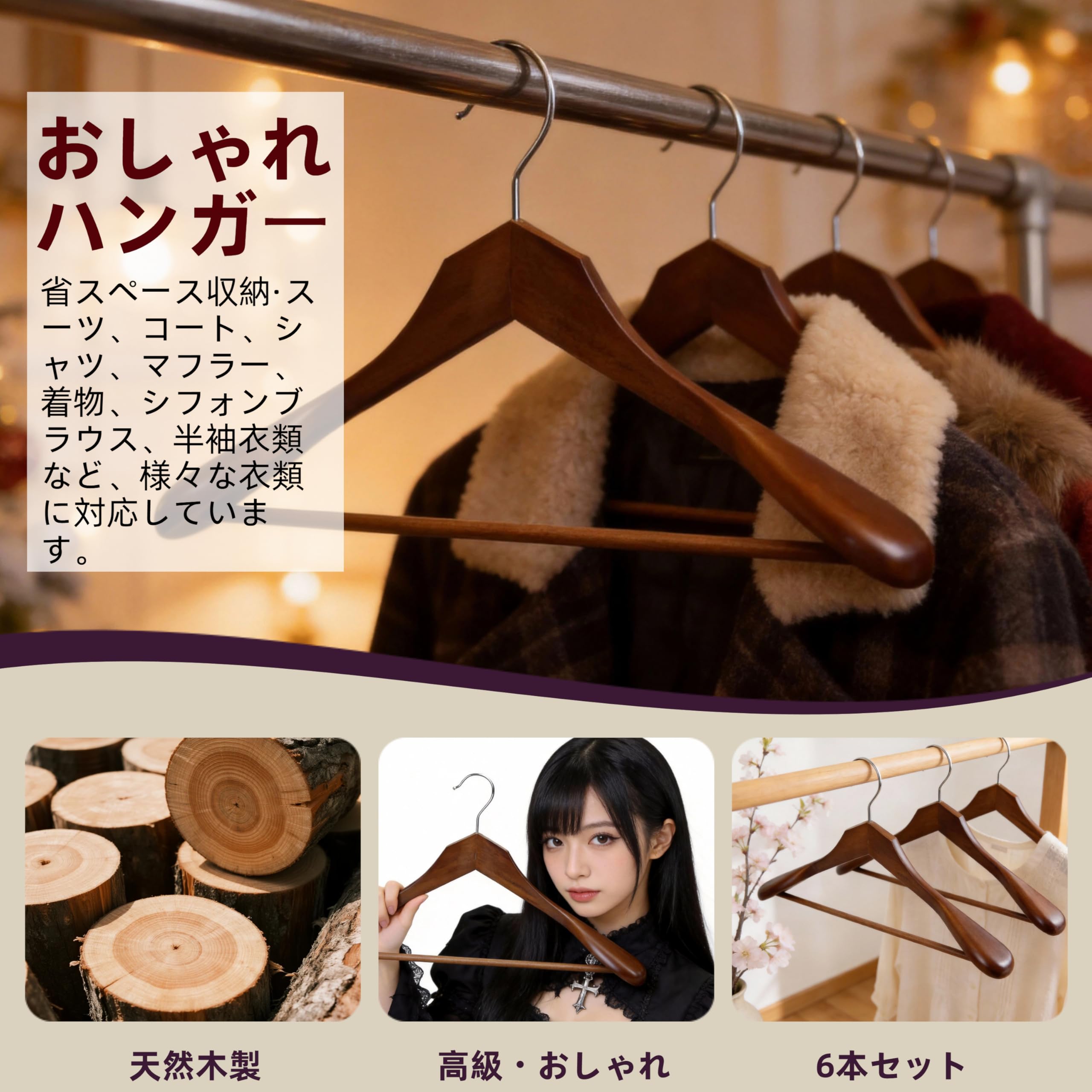 木製ハンガーセット 洋服 スーツ コート用ハンガー 手作 天然高級木 (ナチュラル/6本)