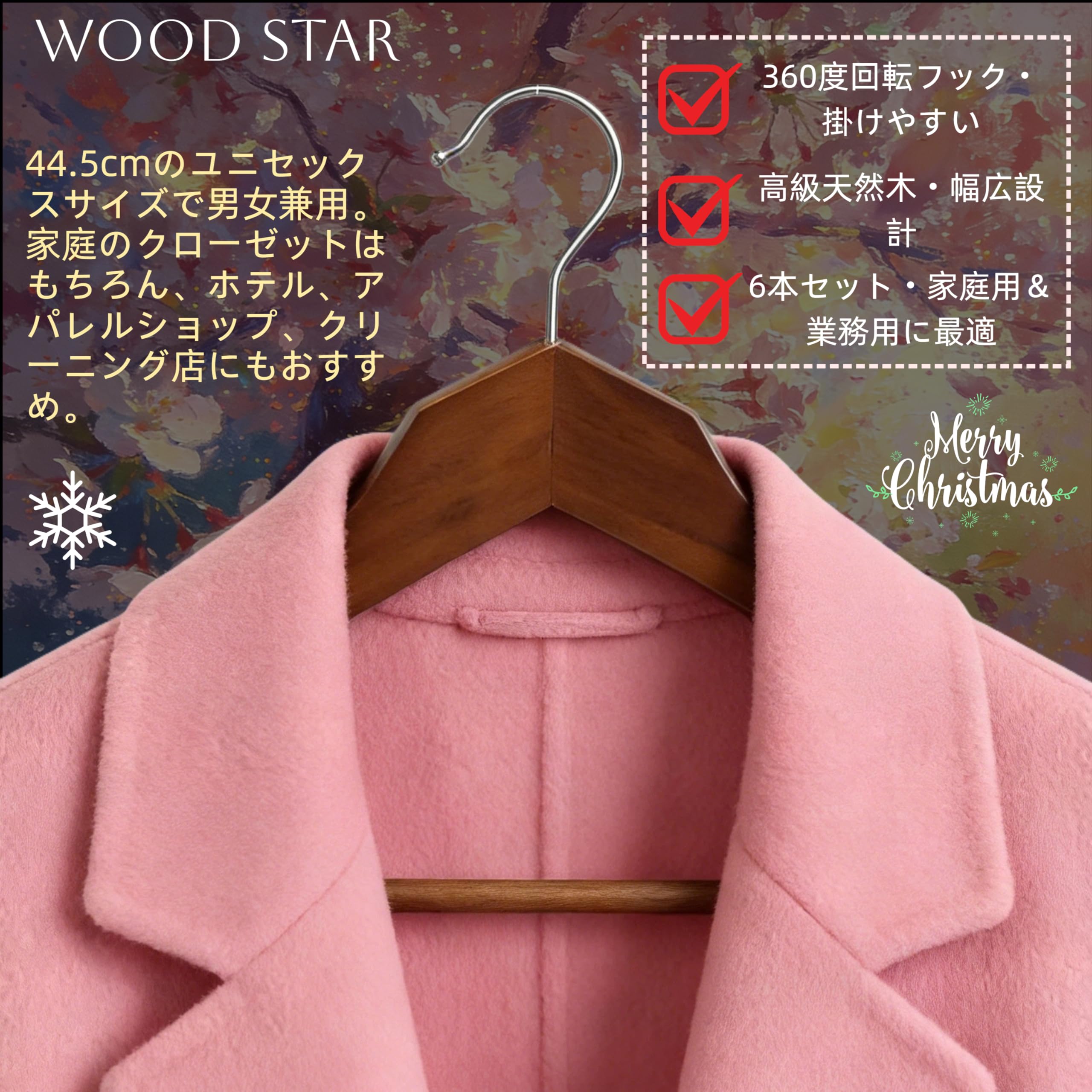 Wood Star 木製ハンガー 強力クリップペイ 6本セット 多機能 ブラウン 手作りの天然高級木材使用、滑り止め付きワイドショルダー 滑らか仕上げ 360度回転フック 無垢材 コートハンガー ドレス、スーツ ジャケット、パンツ、重い衣類、約44.5×5.5cm(ナチュラル)