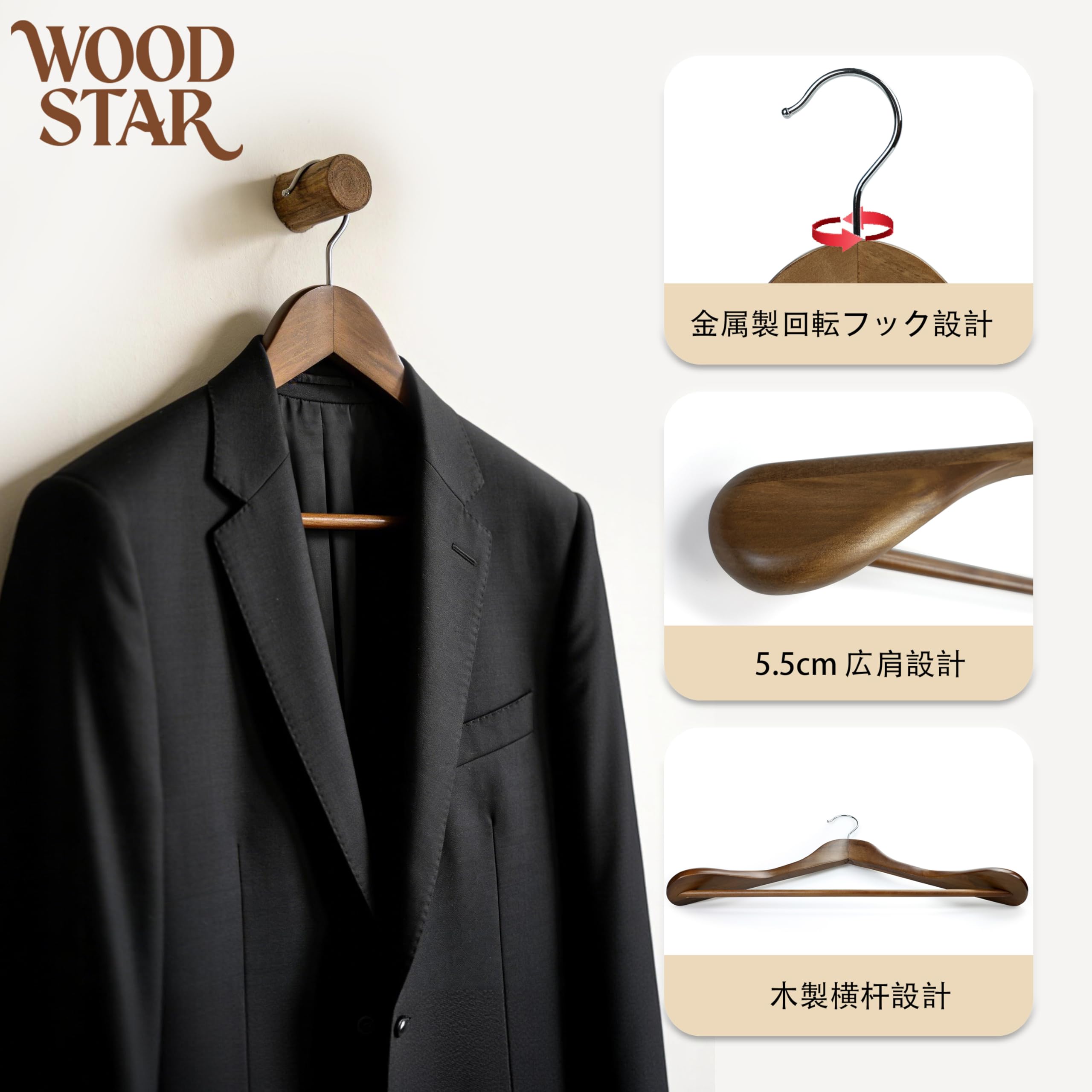 Wood Star 木製ハンガー 強力クリップペイ 6本セット 多機能 ブラウン 手作りの天然高級木材使用、滑り止め付きワイドショルダー 滑らか仕上げ 360度回転フック 無垢材 コートハンガー ドレス、スーツ ジャケット、パンツ、重い衣類、約44.5×5.5cm(ナチュラル)
