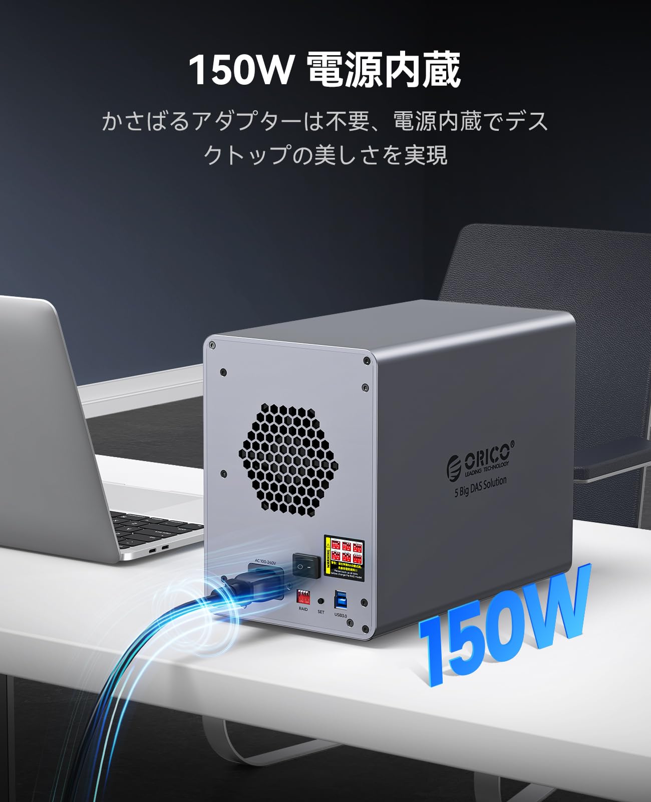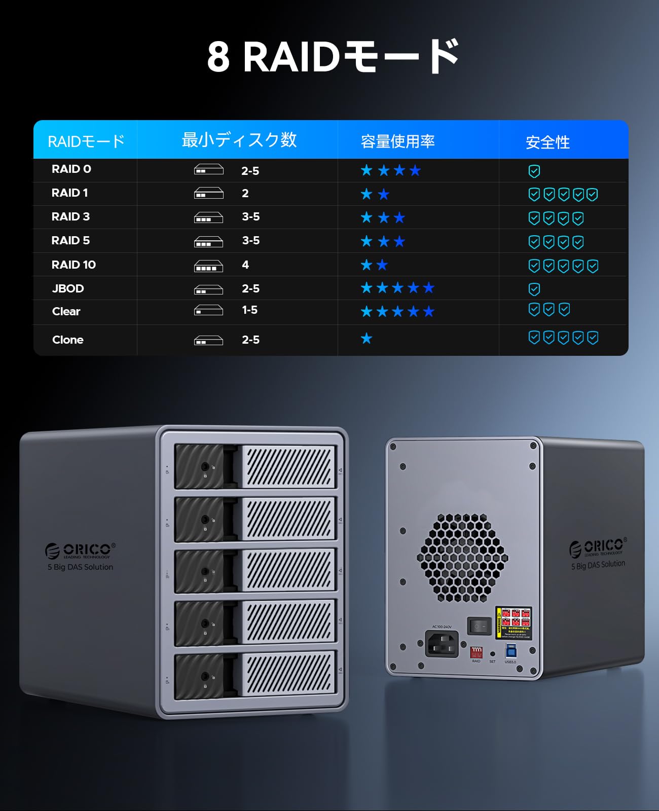 ORICO【RAID機能】HDDケース 5台 22TB*5 USB 3.0接続 8 RAIDモード 3.5インチHDD用 アルミ合金制 HDD 外付けケース プッシュプル取り付け セーフティーロック機能付き 外付けハードディスクケース 9858RU3