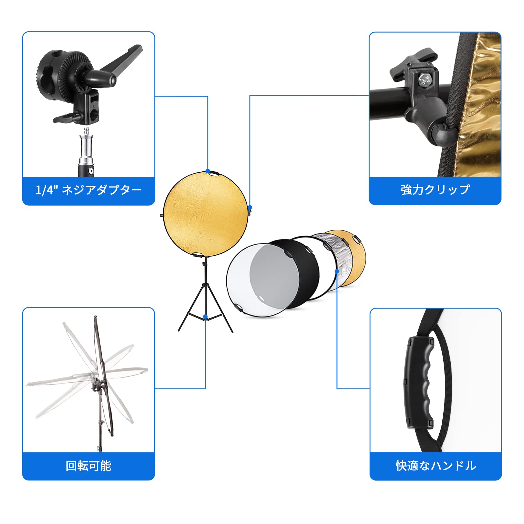 Selens 5-in-1 レフ板 110cm リフレクター クランプホルダー ハンドル付き 折りたたみ式 スタジオ撮影 人物撮影 商品撮影 室外撮影対応 (金/銀/白/黒/半透明)の5色対応