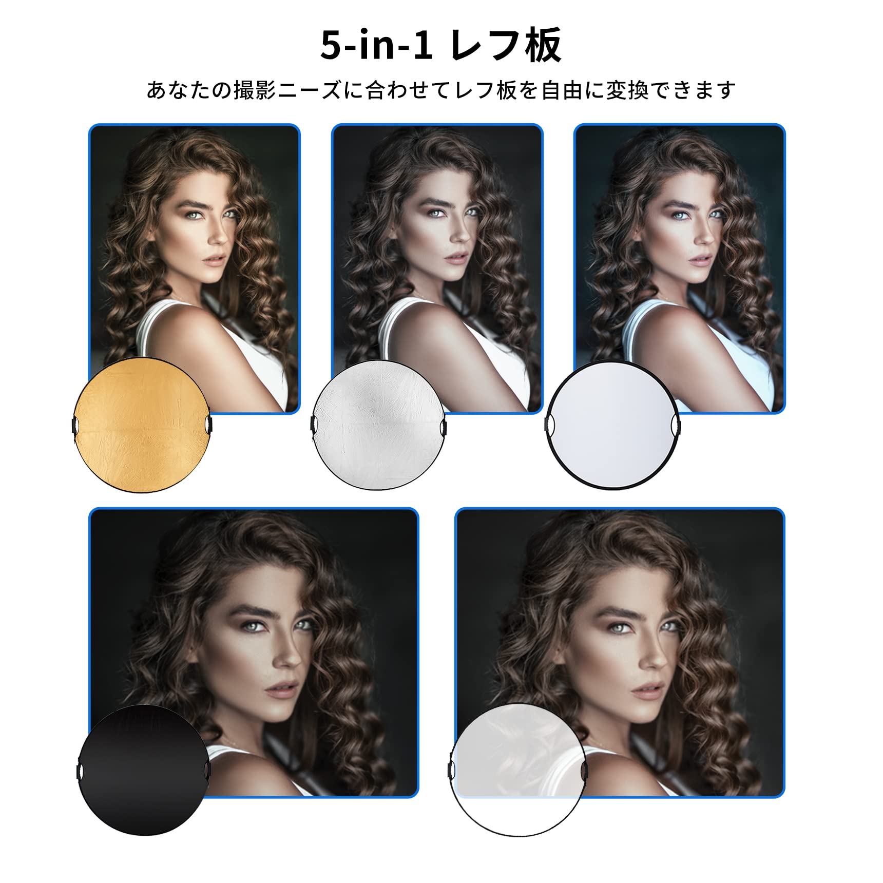 Selens 5-IN-1 撮影用 丸レフ板 60cm ハンドル付き スタジオレフ板 折りたたみ可能 (1枚で5色対応-金/銀/白/黒/半透明)