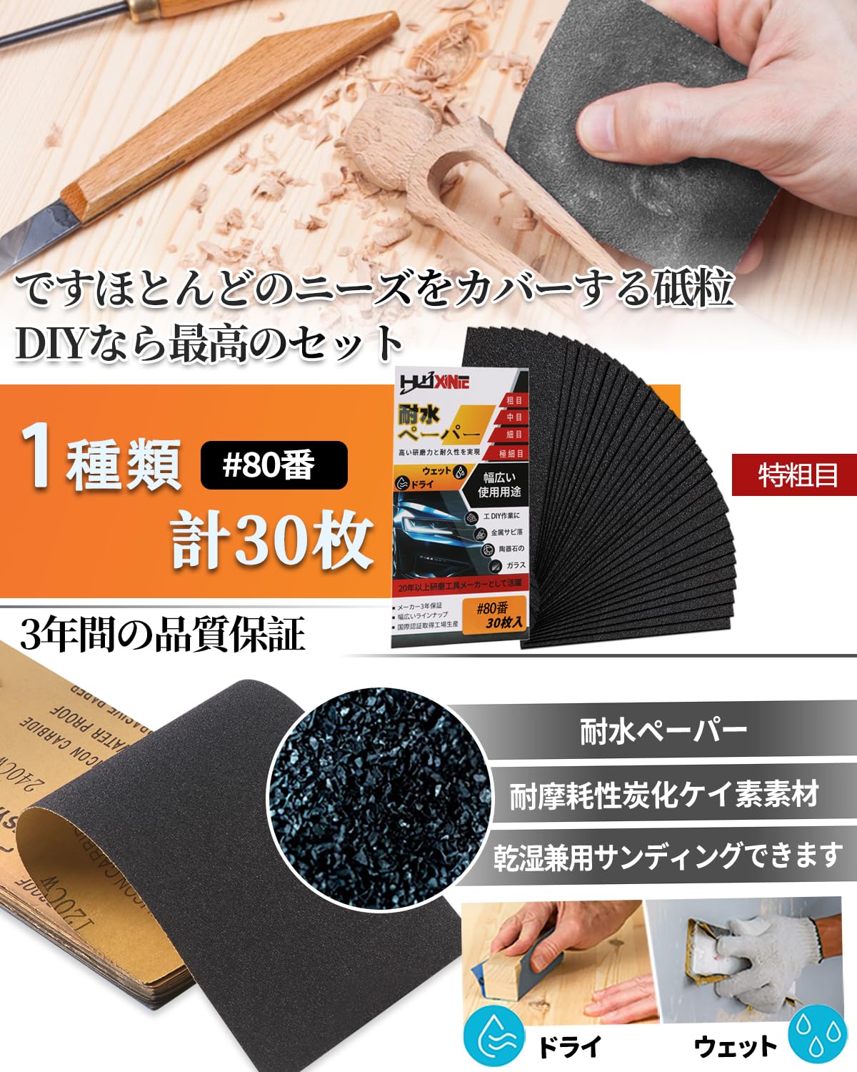 HWXINIE 耐水ペーパー 80番 30枚入り 紙やすり セット 粗目 紙ヤスリ 230×93mm サンドペーパー 耐水ヤスリ,木工DIY作業 車 金属磨き キッチンやトイレの掃除 [メーカー3年保証]