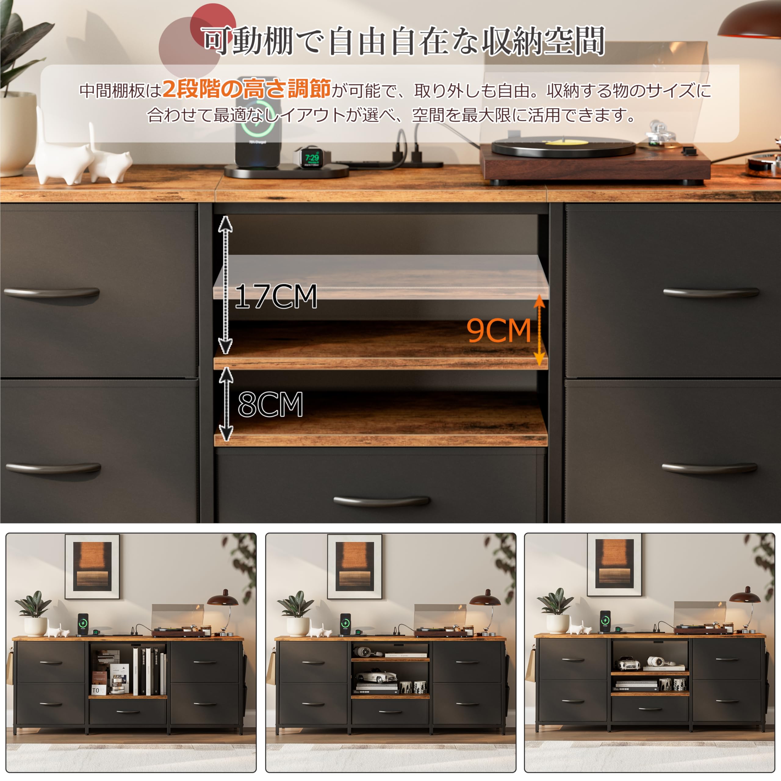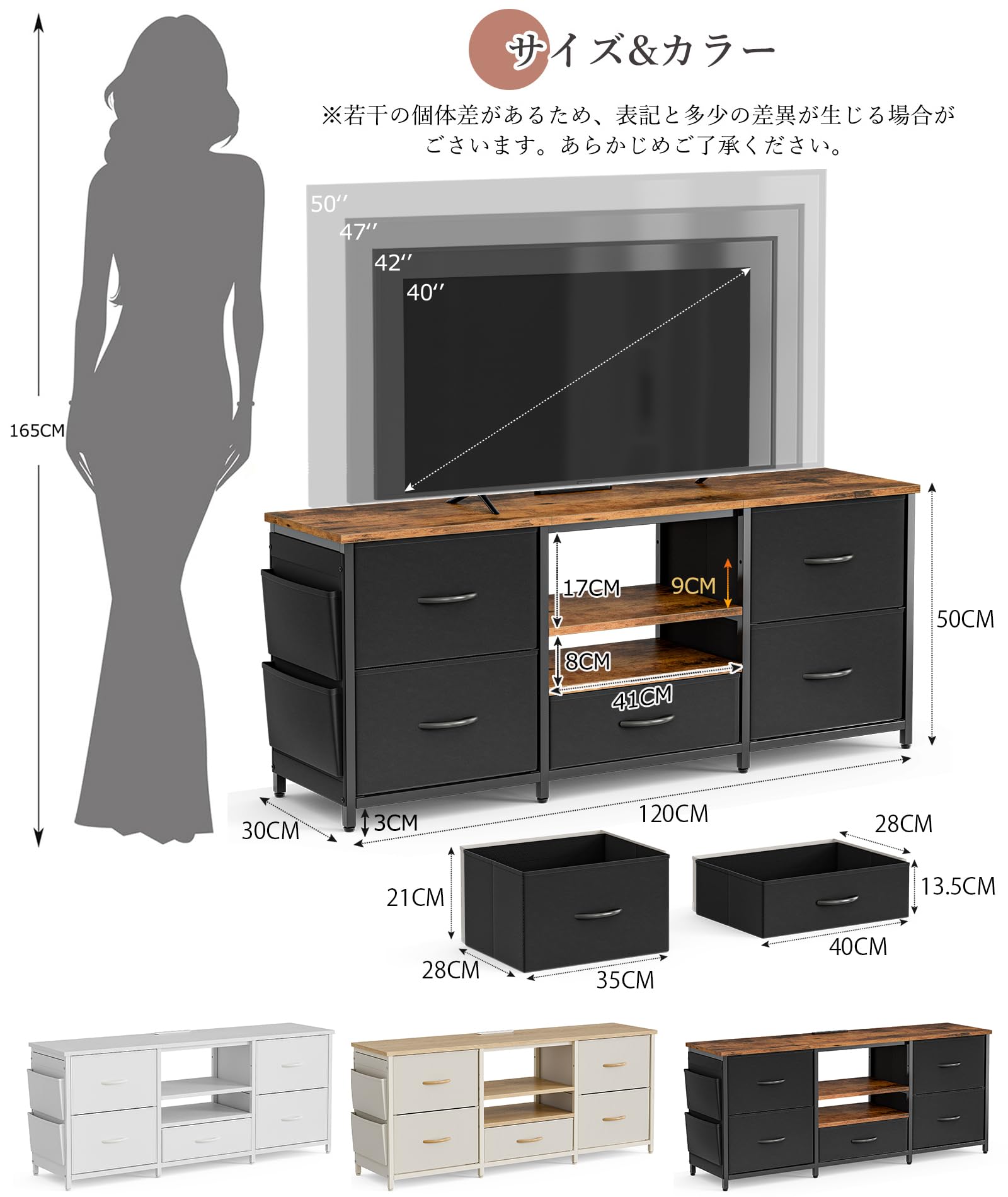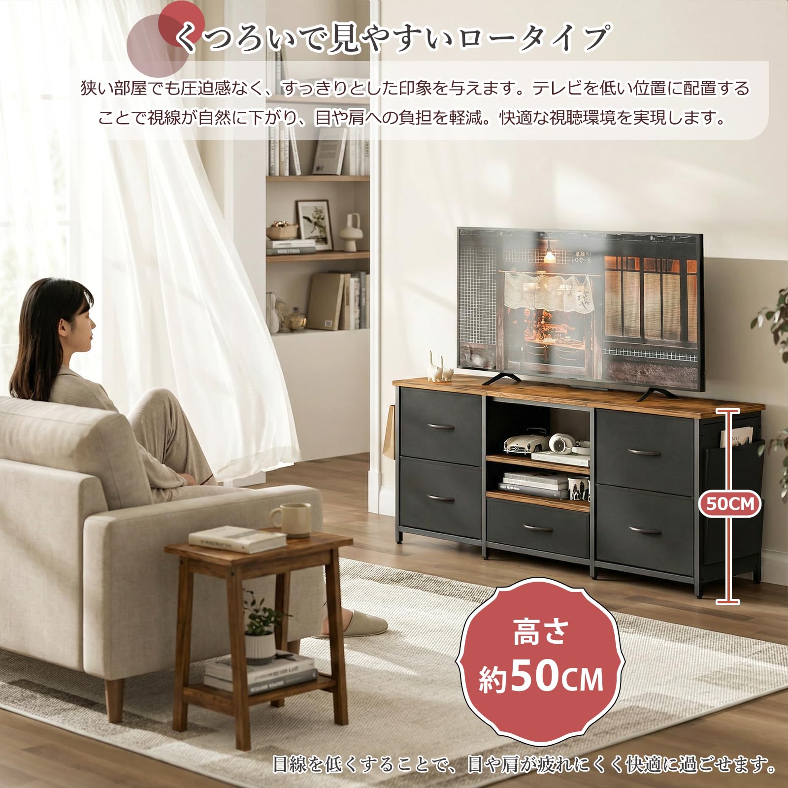 IKIFLY テレビ台 テレビボード 収納チェスト ロータイプ 棚付き 引き出し ローボード ポケット付き テレビラックワイドチェス 大容量 フック付き 32/40/50/55型対応tv台 可動棚 オープン収納 新生活 省スペース 北欧 おしゃれ 総耐荷重150kg(幅120×奥行30×高さ50cm,ブラック)