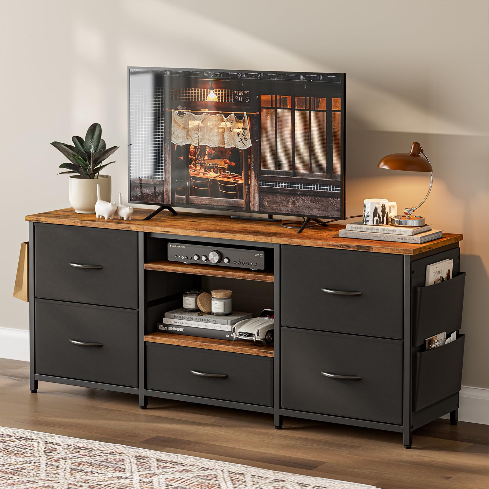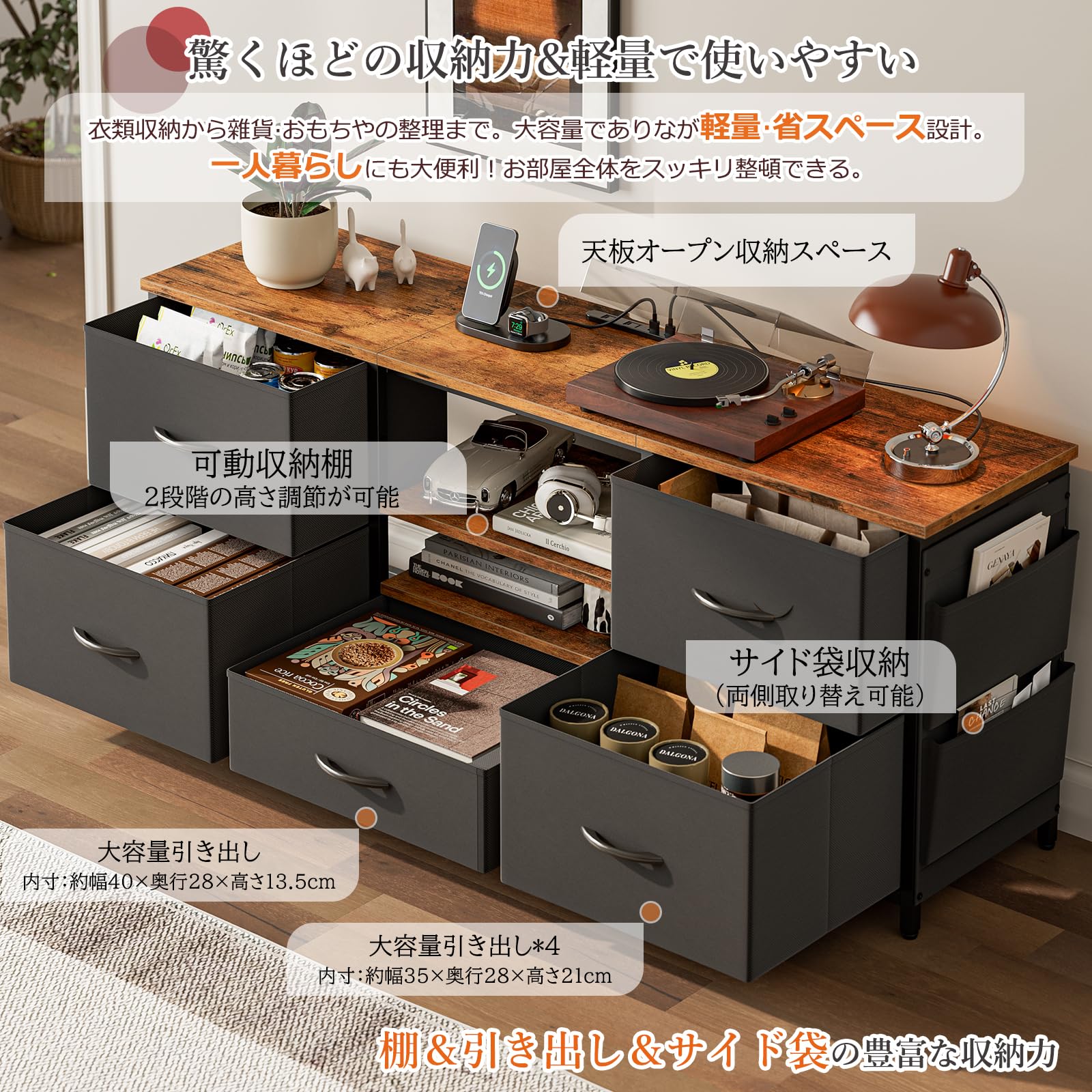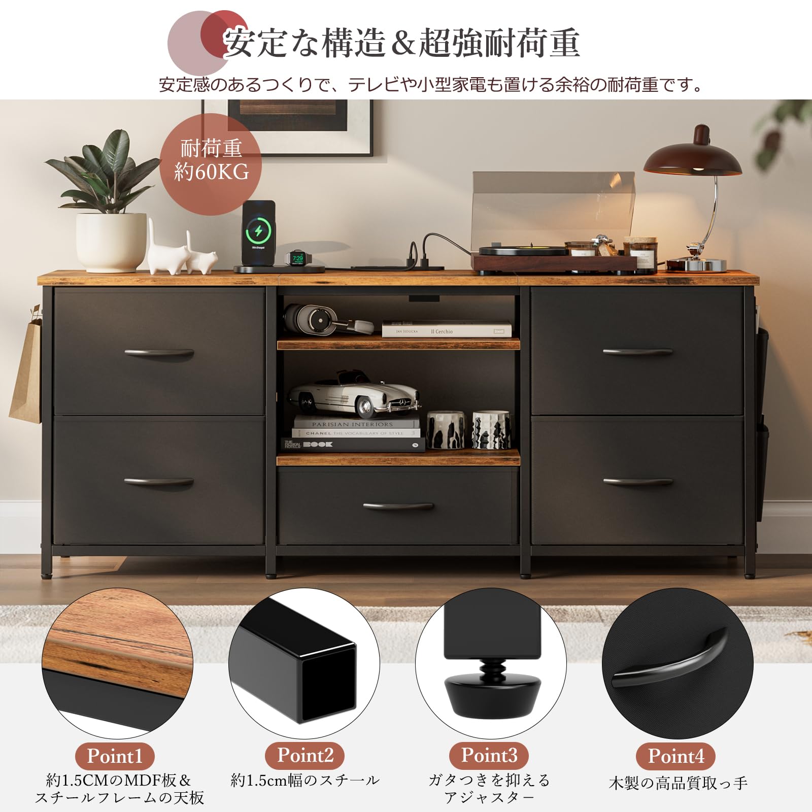 IKIFLY テレビ台 テレビボード 収納チェスト ロータイプ 棚付き 引き出し ローボード ポケット付き テレビラックワイドチェス 大容量 フック付き 32/40/50/55型対応tv台 可動棚 オープン収納 新生活 省スペース 北欧 おしゃれ 総耐荷重150kg(幅120×奥行30×高さ50cm,ブラック)