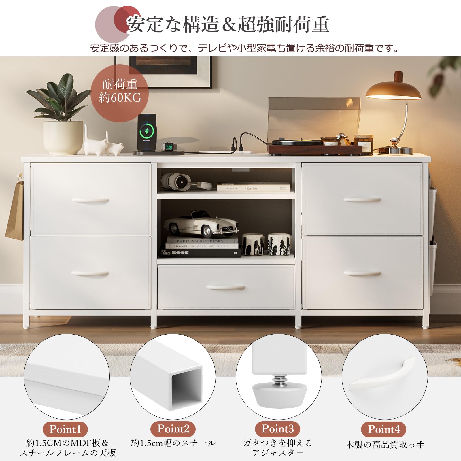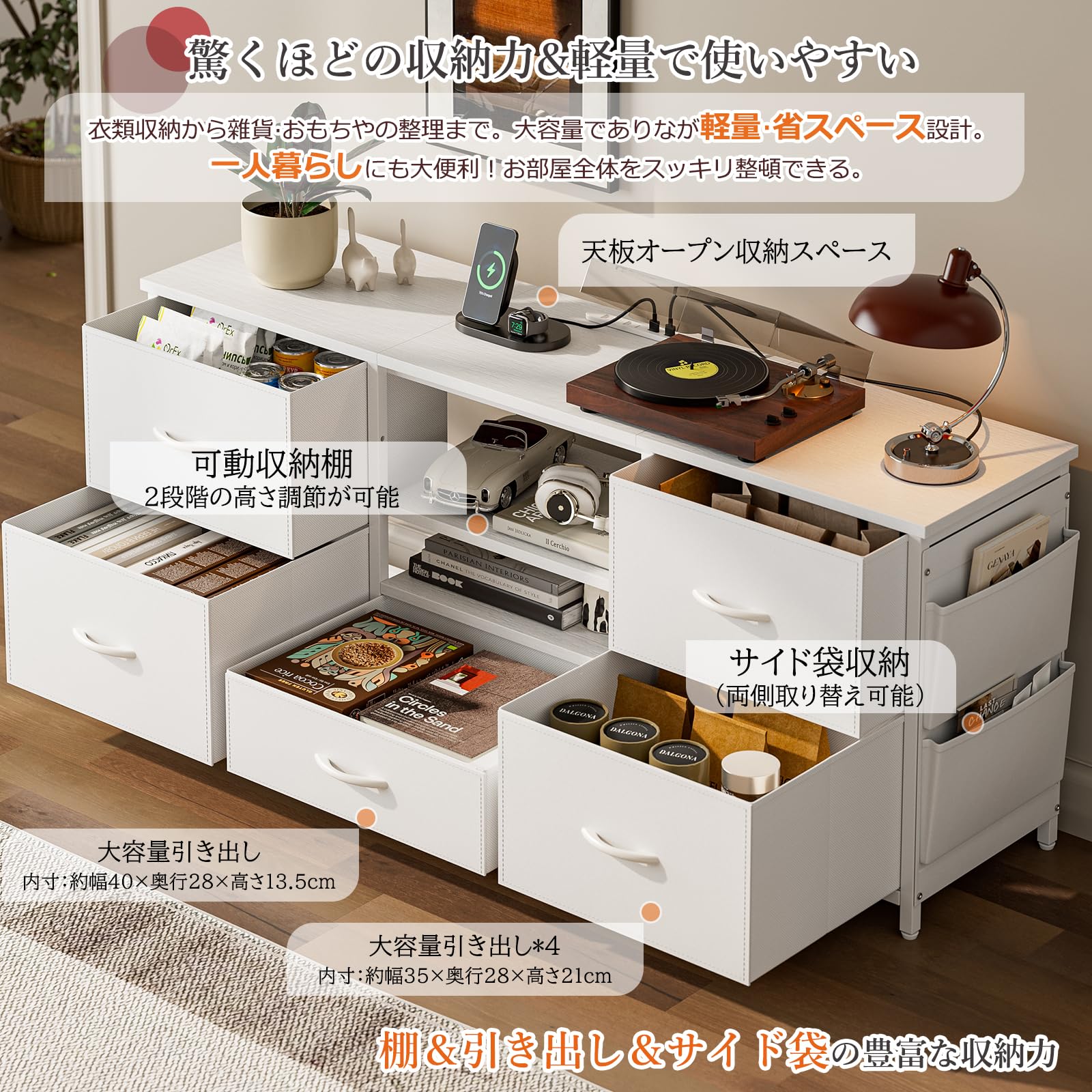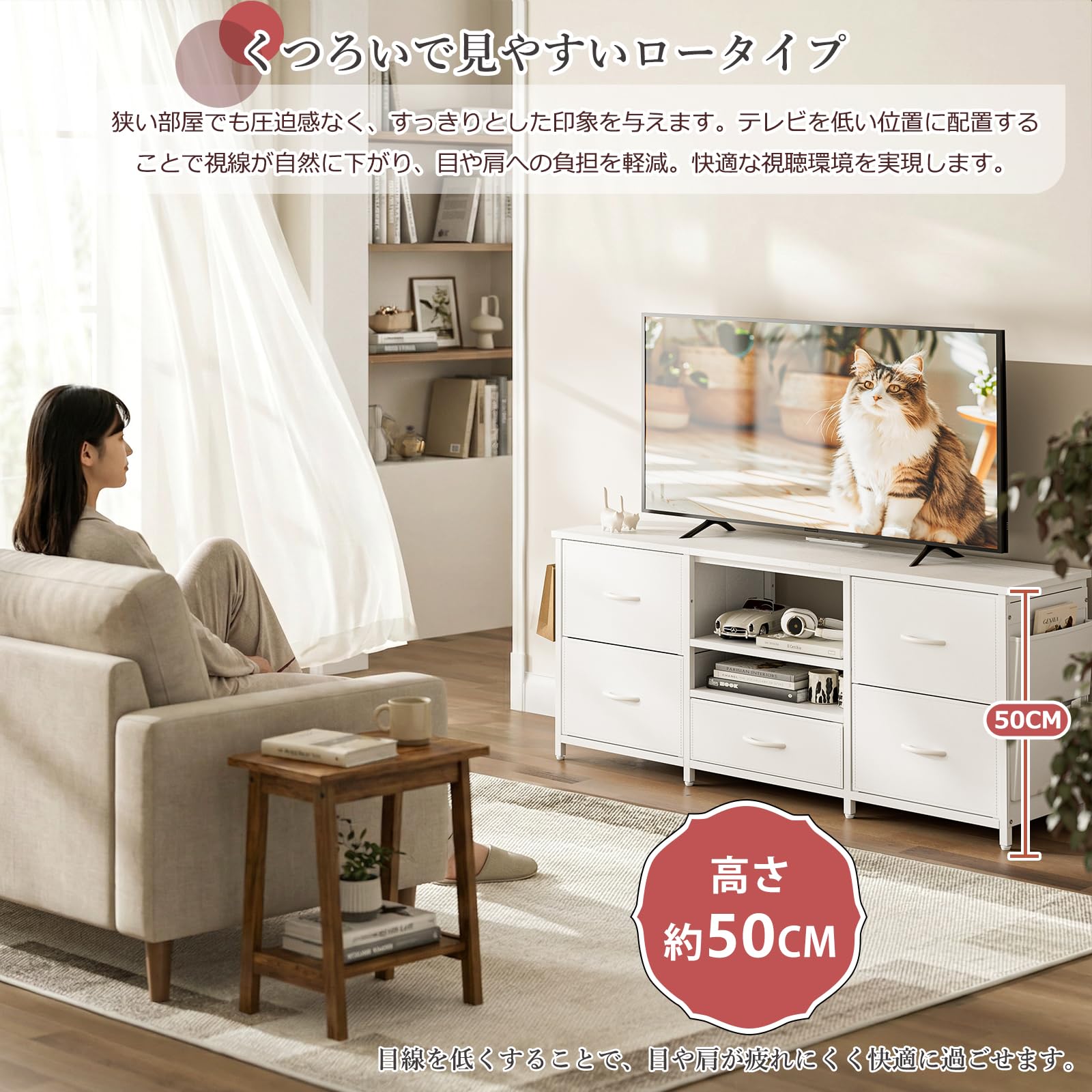 IKIFLY テレビ台 ローボード 収納チェスト ロータイプ 棚付き 引き出し付き ワイドチェスト 大容量 可動棚 オープン 42 32インチ 55型まで対応 省スペース 北欧 おしゃれ ウォールナット 耐荷重50kg 幅135×奥行30×高さ63cm (ホワイト)