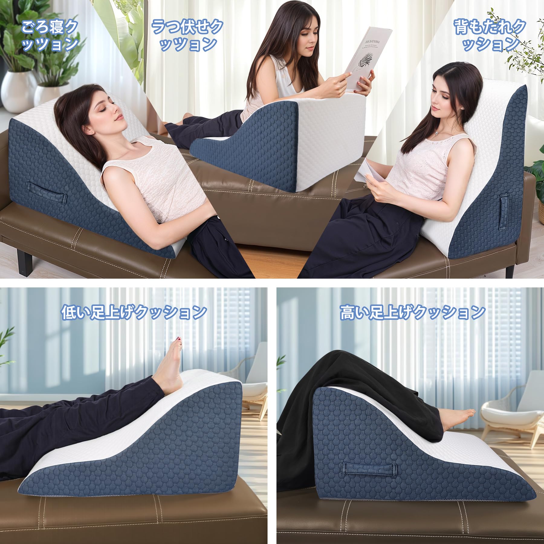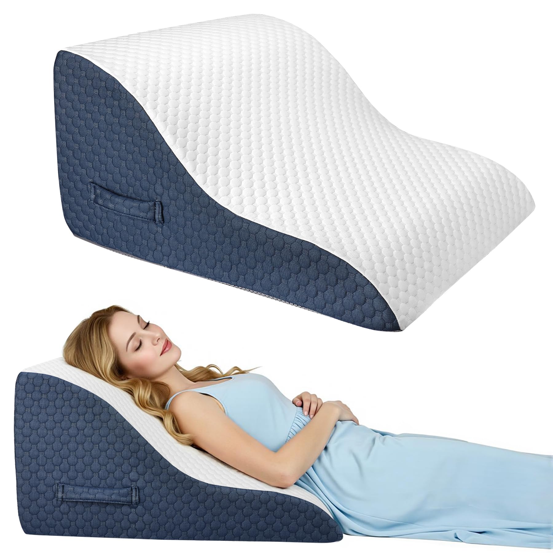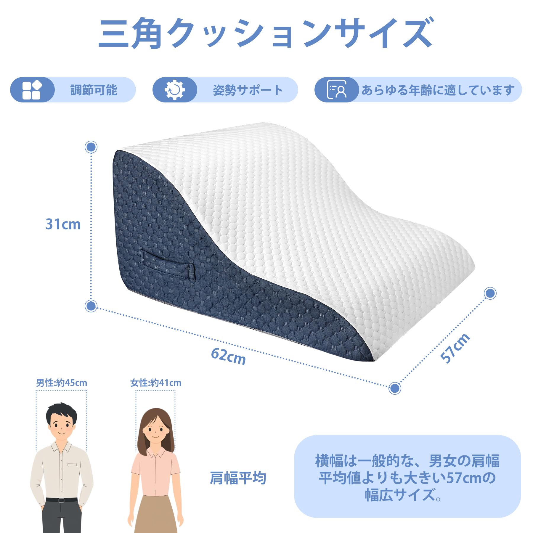 Azamia 三角クッション 腰枕 三角枕 背もたれ クッション 高さ調節可能 傾斜枕 足まくら 横向き寝 体位変換 テレビ枕 大きい 高反発 ウェッジ枕 背あて ランバーサポート ベルボア生地 カバー洗える (青と白)
