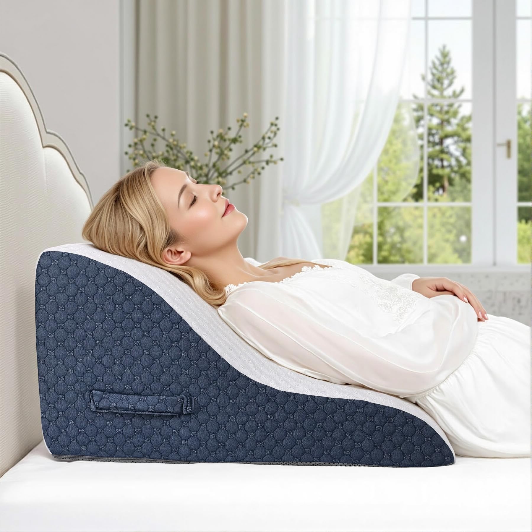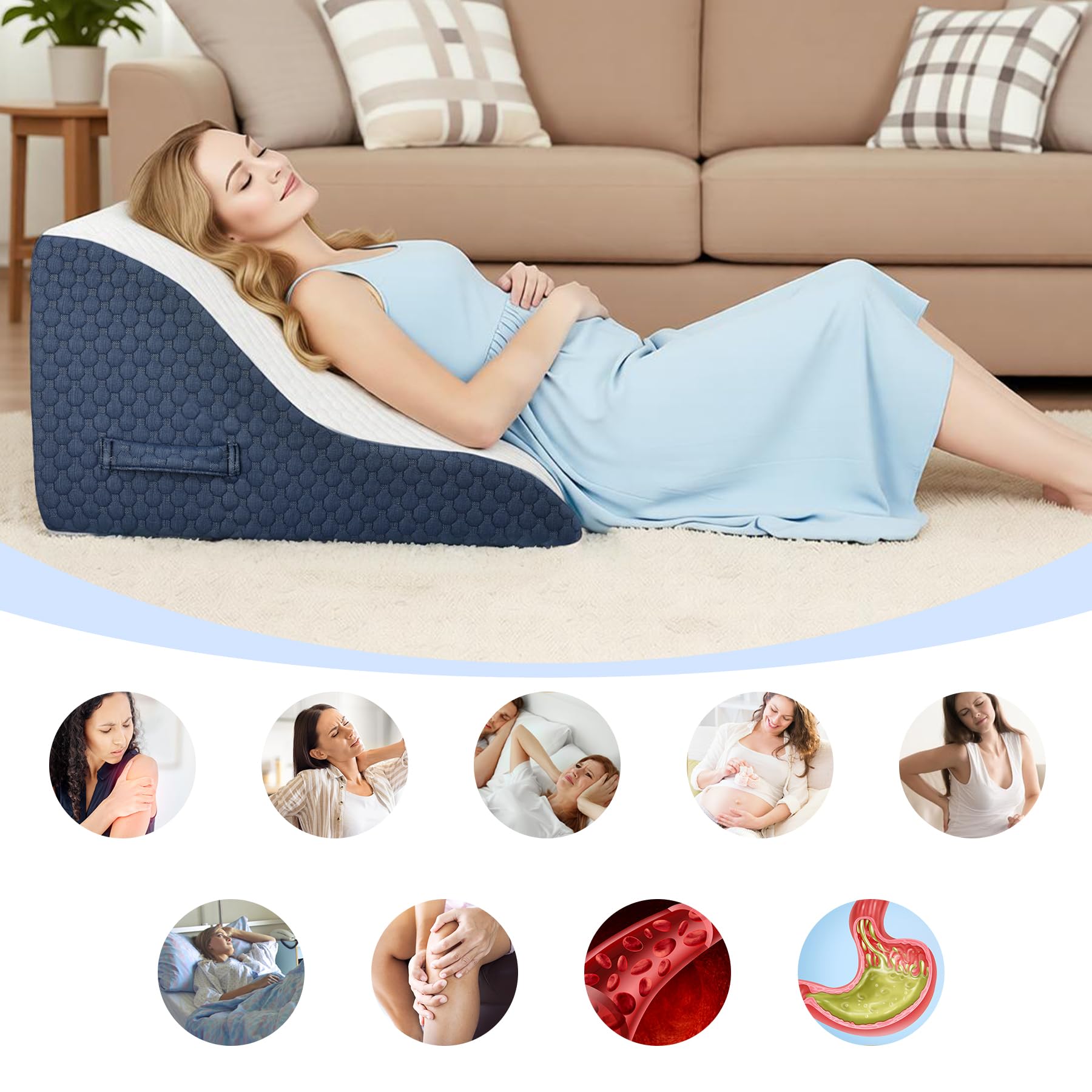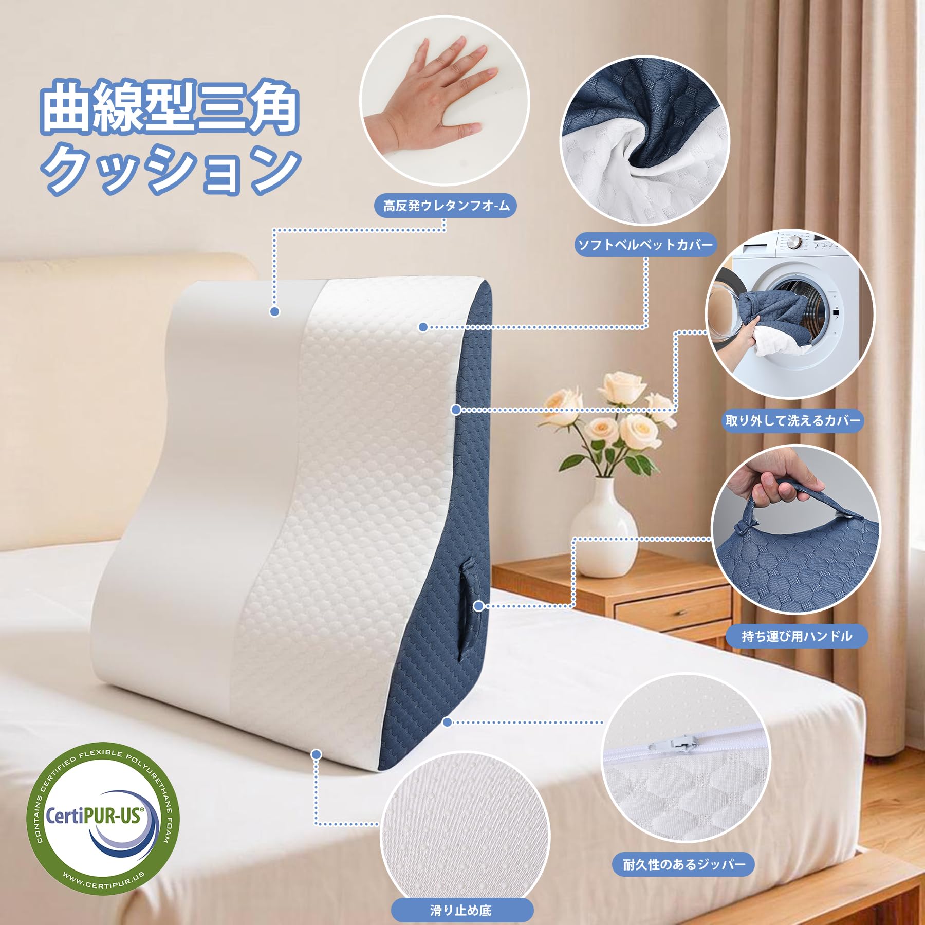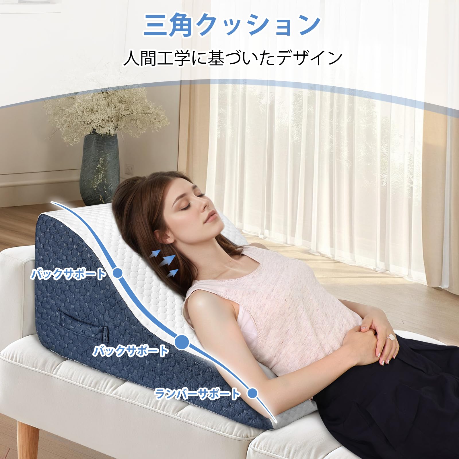 Azamia 三角クッション 腰枕 三角枕 背もたれ クッション 高さ調節可能 傾斜枕 足まくら 横向き寝 体位変換 テレビ枕 大きい 高反発 ウェッジ枕 背あて ランバーサポート ベルボア生地 カバー洗える (青と白)