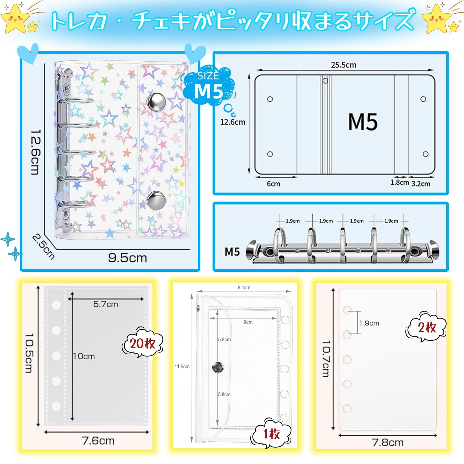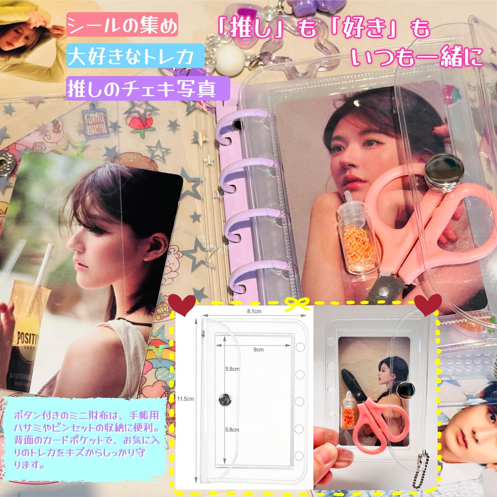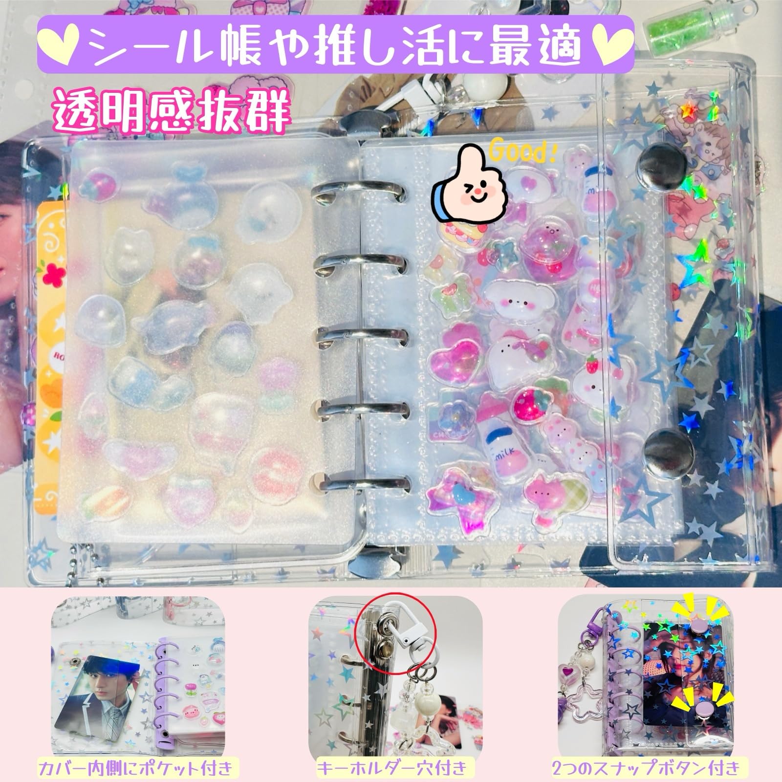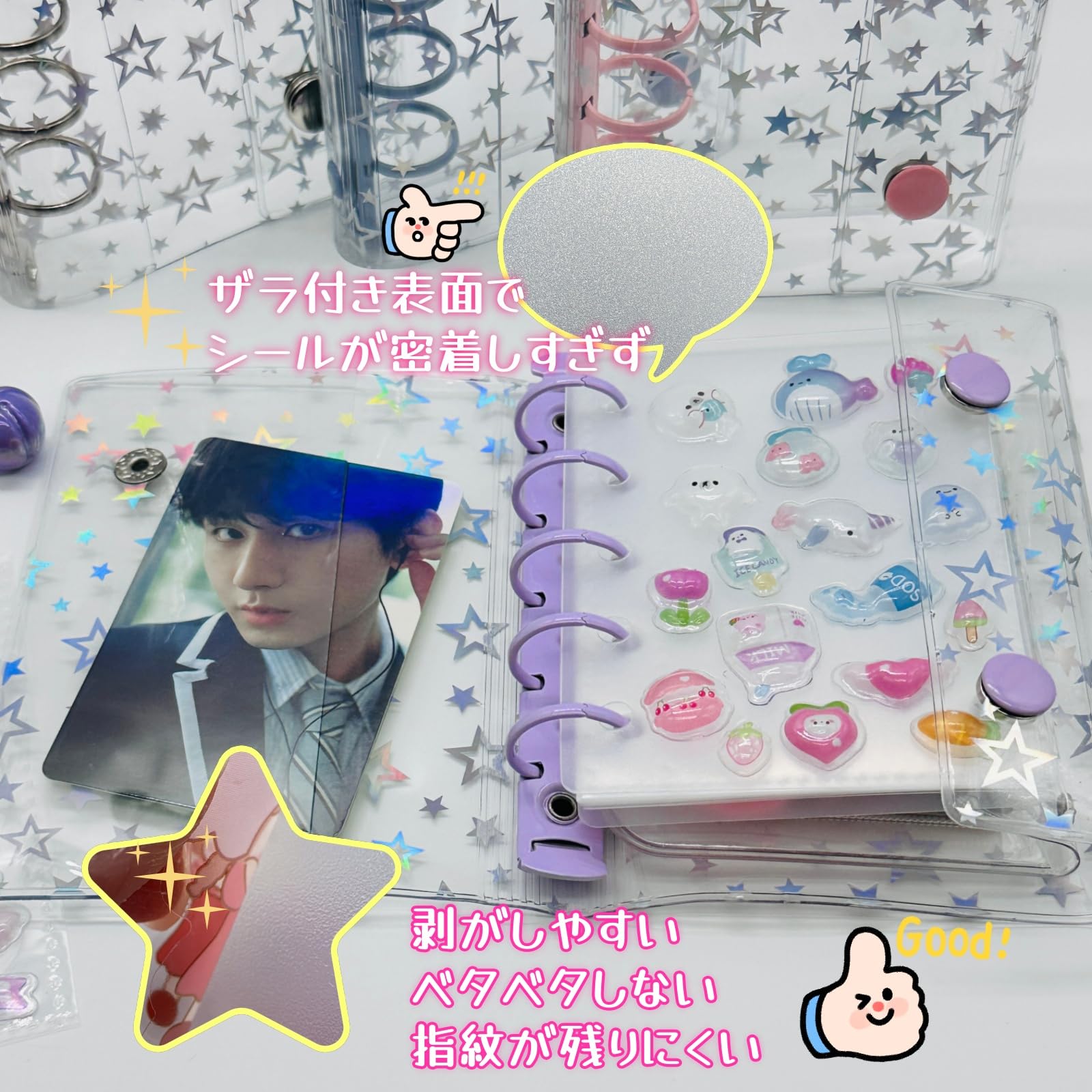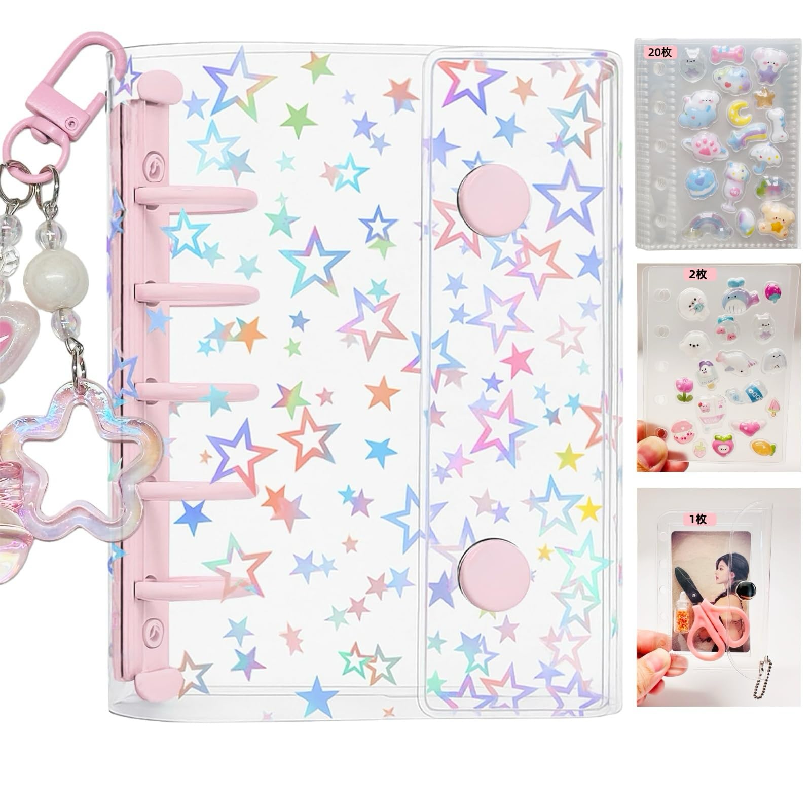 Muratuki 透明バインダー 星柄 シール収納手帳M5,プラバン ミニ ポケットサイズ【バインダー×1個 リフィル×20枚 下敷き×2枚 ミニ財布×1個】3層構造PPシート カードスリーブ 推し活収納 剥がせるシール台紙 女の子 コラージュノート クリア手帳 プリ帳 システム手帳 (ピンク)