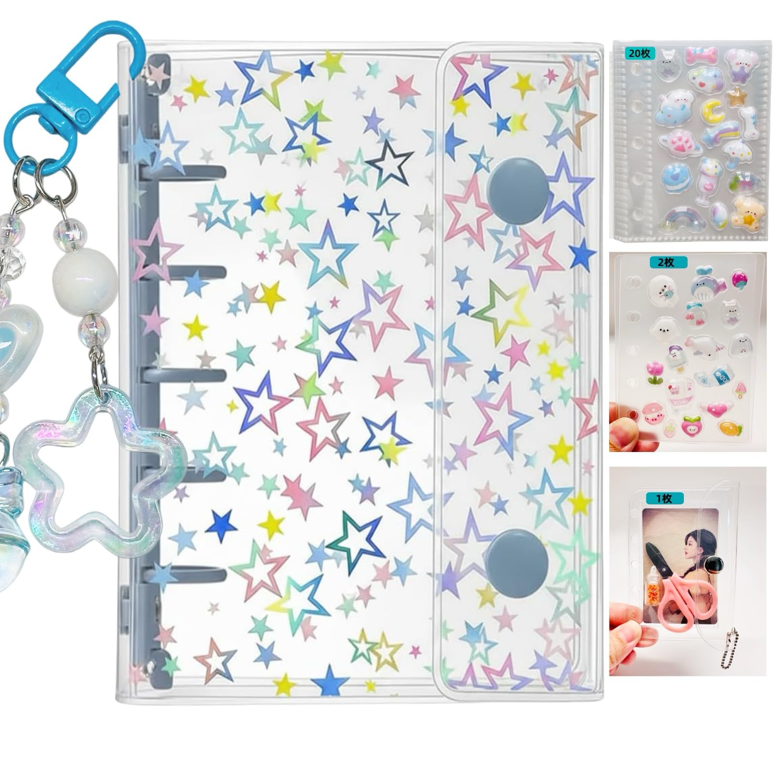 Muratuki 透明バインダー 星柄 シール収納手帳M5,プラバン ミニ ポケットサイズ【バインダー×1個 リフィル×20枚 下敷き×2枚 ミニ財布×1個】3層構造PPシート カードスリーブ 推し活収納 剥がせるシール台紙 女の子 コラージュノート クリア手帳 プリ帳 システム手帳 (ブルー)