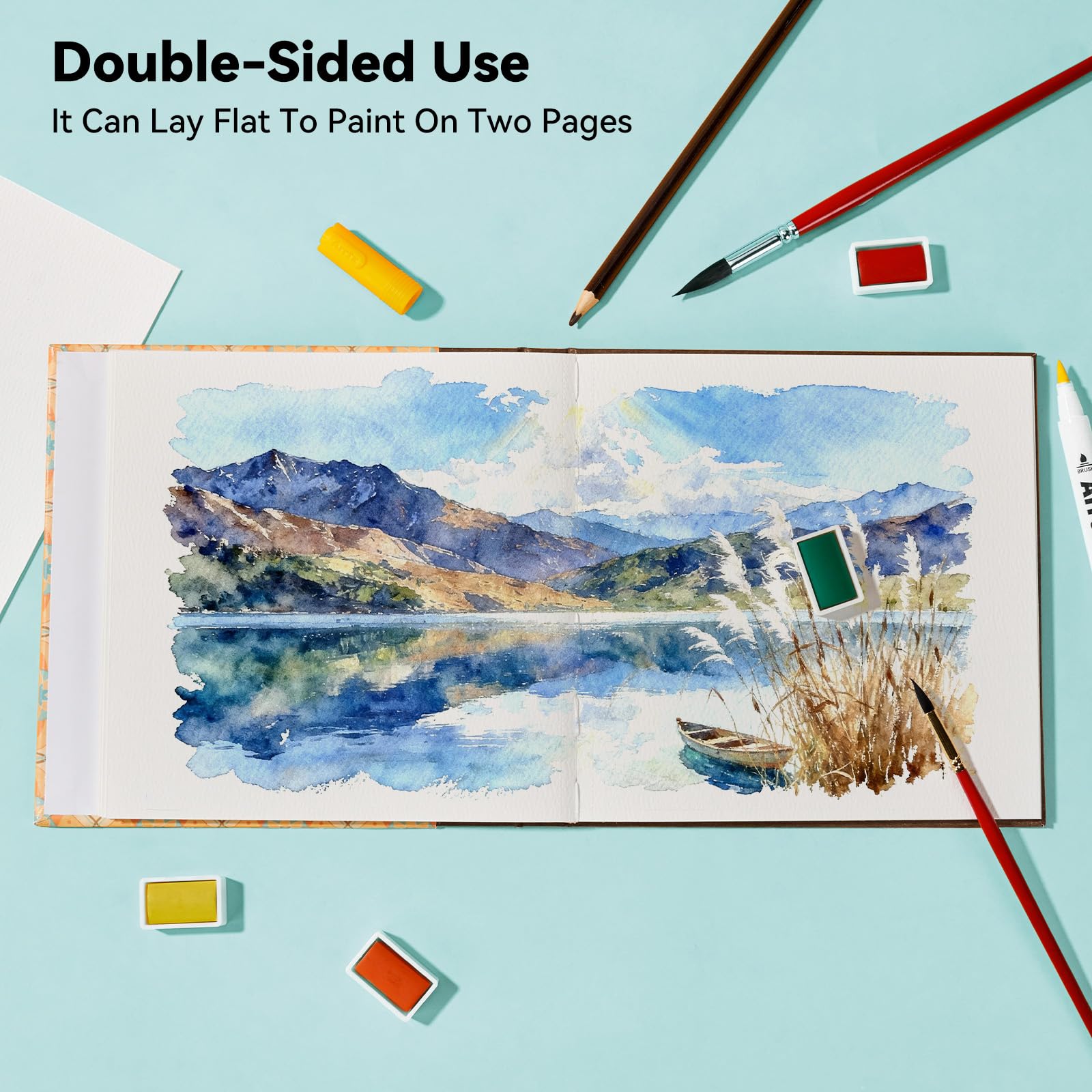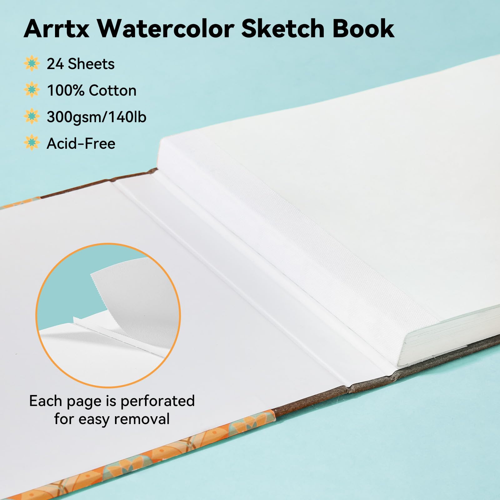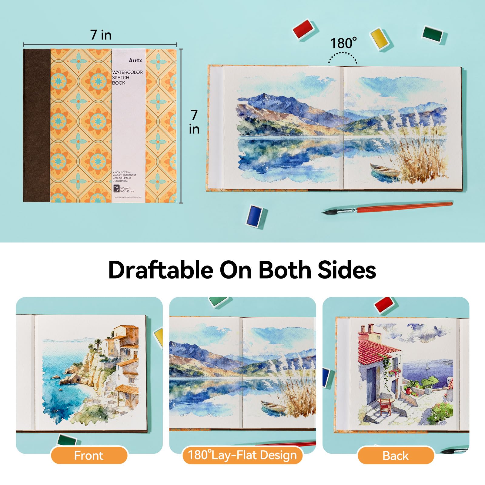 Arrtx 正方形 水彩紙 スケッチブック 7.09x7.09インチ 140ポンド 300GSM コットン100%紙 コールドプレス 24シート ハードカバー 水彩日記帳 旅行ノートとして アーティスト 大人 学生