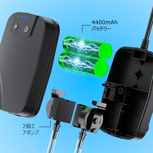 エアーポンプ 水槽/釣り THYESCOM 小型エアポンプ 停電自起動&連続稼働&間隔稼働モード 携帯酸素提供ポンプ 2600mAhリチウム電池内蔵 最大36時間動作 1.5L/min x2口空気排出量 静音設計 水槽/魚の移送/停電時用/釣り用 (二つ吐出口)
