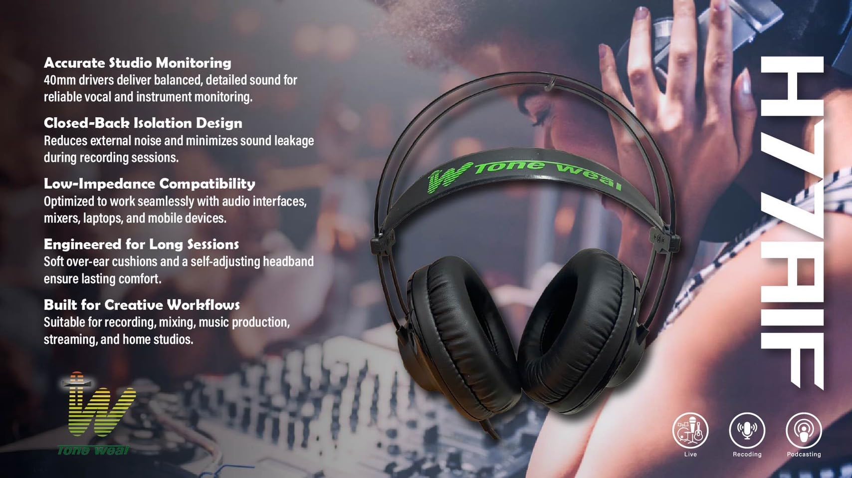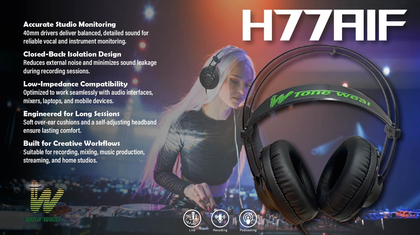 Tone weal H77AIF セミプロフェッショナルスタジオモニタリングヘッドフォン – 40mmハイファイドライバー、クローズドバックオーバーイヤーデザイン、録音、ミキシング、ストリーミング、ポッドキャスト用の低インピーダンス。