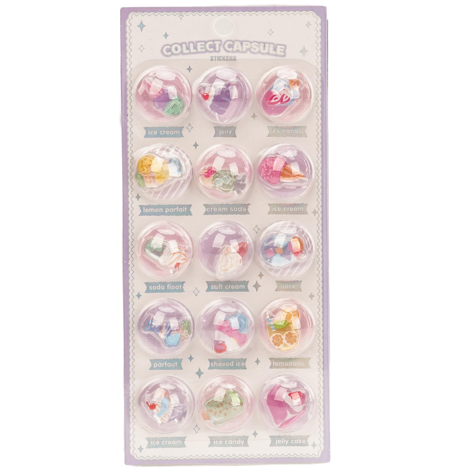 【話題のシール風デザインが新登場!】 SNSで大人気のぷっくりドロップ型シールを、さらに可愛くアレンジした6つのテーマ別カプセルシールが登場しました!透明なカプセルの中に広がる、星月、おばけ、海の生き物、カラフルキャンディ、甘~いアイスクリームなど、あなたの好きな世界観をぎゅっと閉じ込めました。 【商品の特徴】 選べる6テーマ: 天空・星月:ロマンチックな夜空と星の世界 おばけ:ちょっと不気味でかわいいおばけたち 海洋:カラフルな魚やタコ、貝殻の海の世界 キャンディ:色とりどりのキャンディとスイーツ アイスクリーム:思わず食べたくなるフレーバーアイス その他スペシャルミックス(季節限定など) ぷっくり&つやつや高品質: まるで飴玉のようなぷっくりとした立体的なフォルムと、つややかで透明感のある美しい仕上がりです。 コレクション心をくすぐる90種: 各テーマ15種類、全90種類の豊富なバリエーション。コンプリートしたくなります。 ランダム封入のワクワク感: 1パック(15個入り)は全てランダム。開けるまでのお楽しみ要素が、より一層シール集めを楽しくします。 【使用シーン】 手帳や日記のワンポイントデコレーション スマホケースやタブレットカバーのカスタマイズ ペンケース、下敷きなどの文房具に お友達とのシール交換会の目玉に お子様へのご褒美やプレゼントに この機会に、ぜひ新しいシールコレクションの世界をお楽しみください!