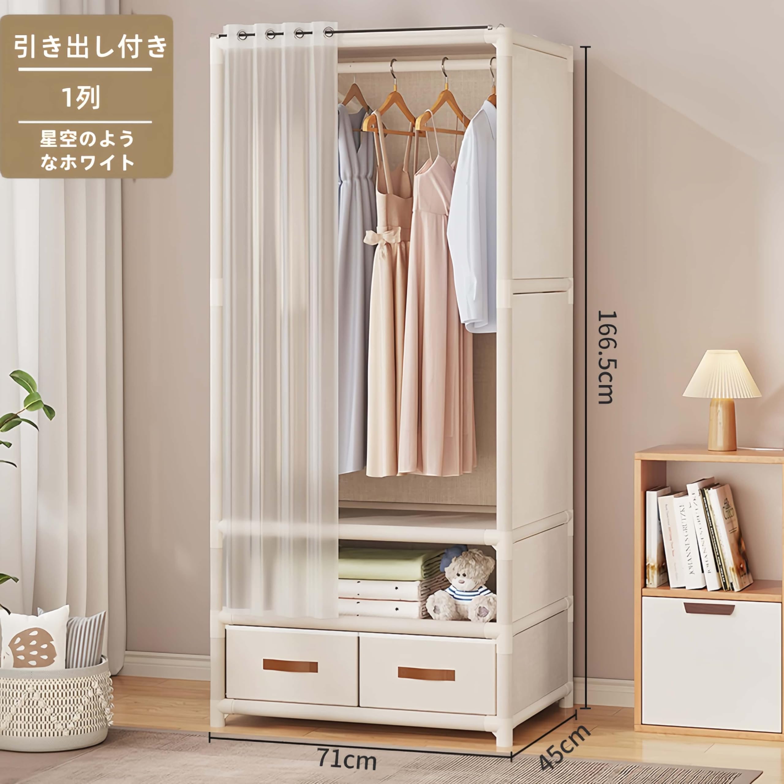 ワードローブ カバー付き ハンガーラック 引き出し付き 簡易ポータブル組立クローゼット 防湿・防塵・防カビ 日本語説明書付き 簡単組み立て式 大容量 収納クローゼット 洋服収納 高耐荷重 (1列-幅71*奥45*高166.5cm)