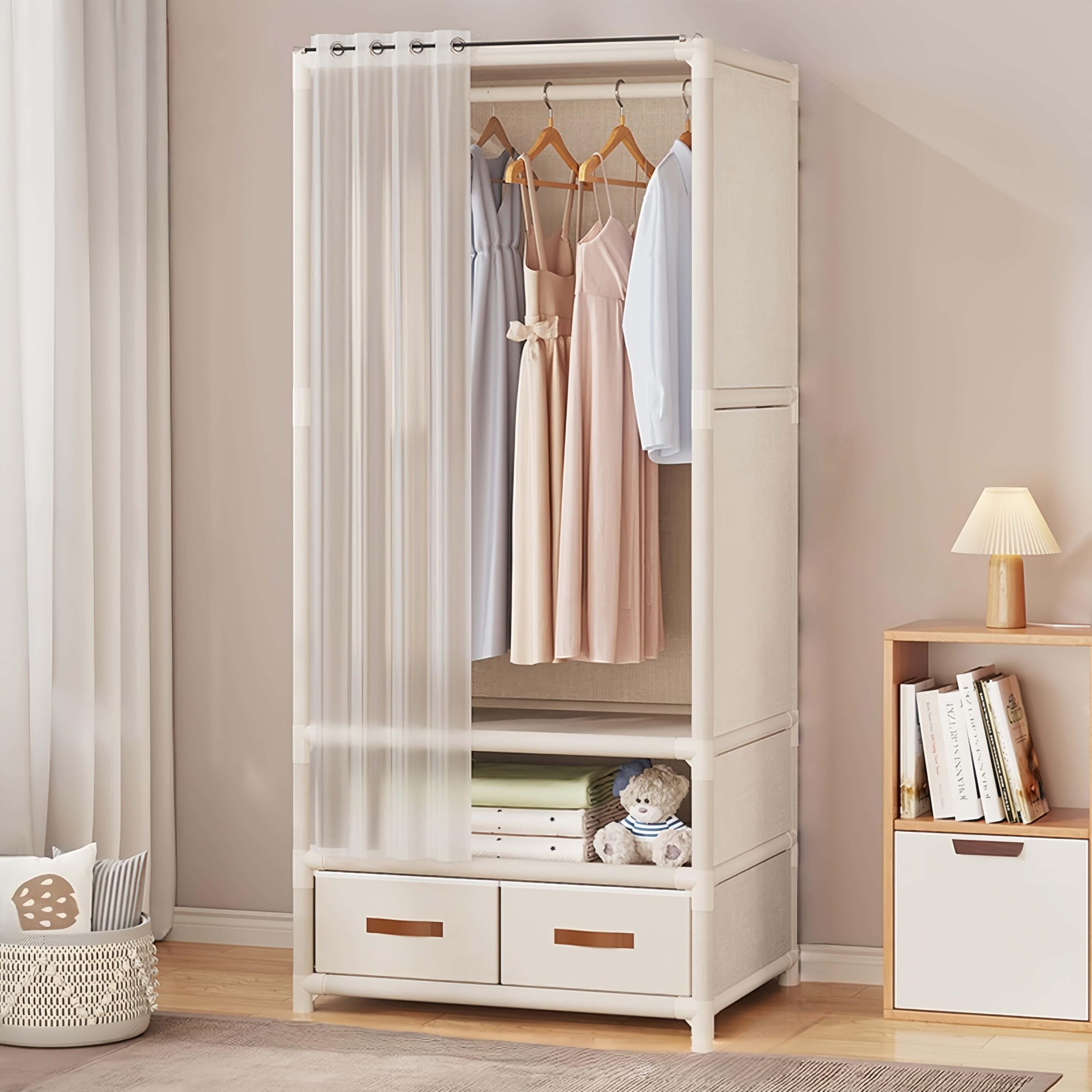 LuluLife ワードローブ クローゼットハンガー カバー付き 大容量 収納棚 シンプル クローゼットハンガー 整理タンス シングル組み立て式 防水 防塵 防汚 幅88*奥行45*高さ170cm (S、D)