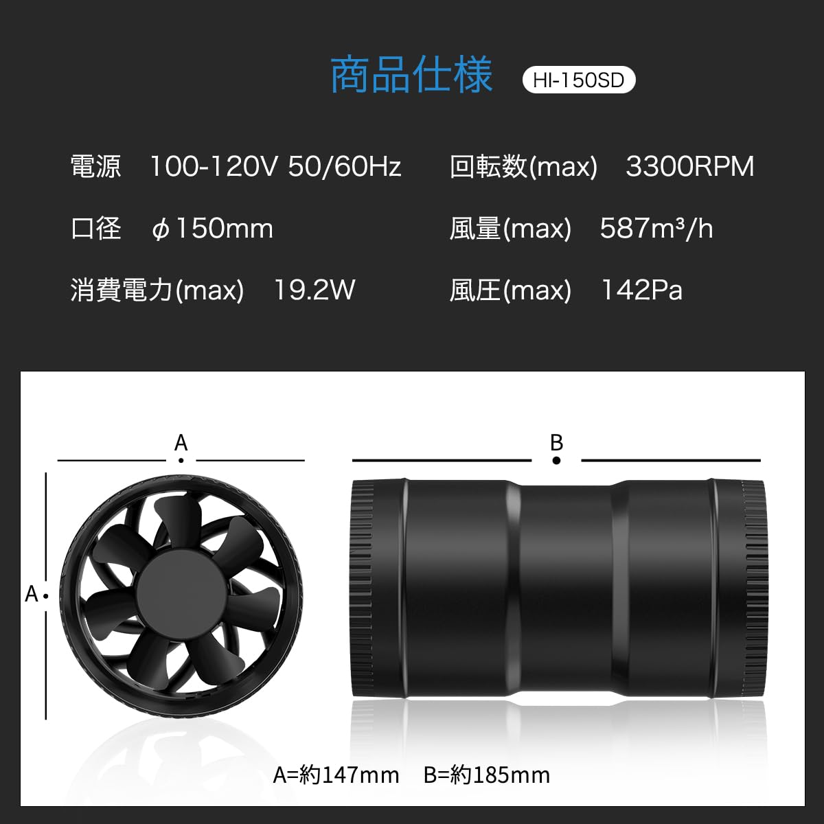 Hon&Guan ダクトファン セット 150mm 中間取付型【インボイス制度登録店】換気扇 パイプファン 排気 強力 省エネ 静音 ダクト用/窓用/卓上用/塗装ブース用/家焼肉 丸形タイプ 産業用換気扇 ダクトホース入り/2.5m1本 クランプ入り/2個 汎用テープ付 取扱説明書付(HI-150SD/φ150mm,セット品)