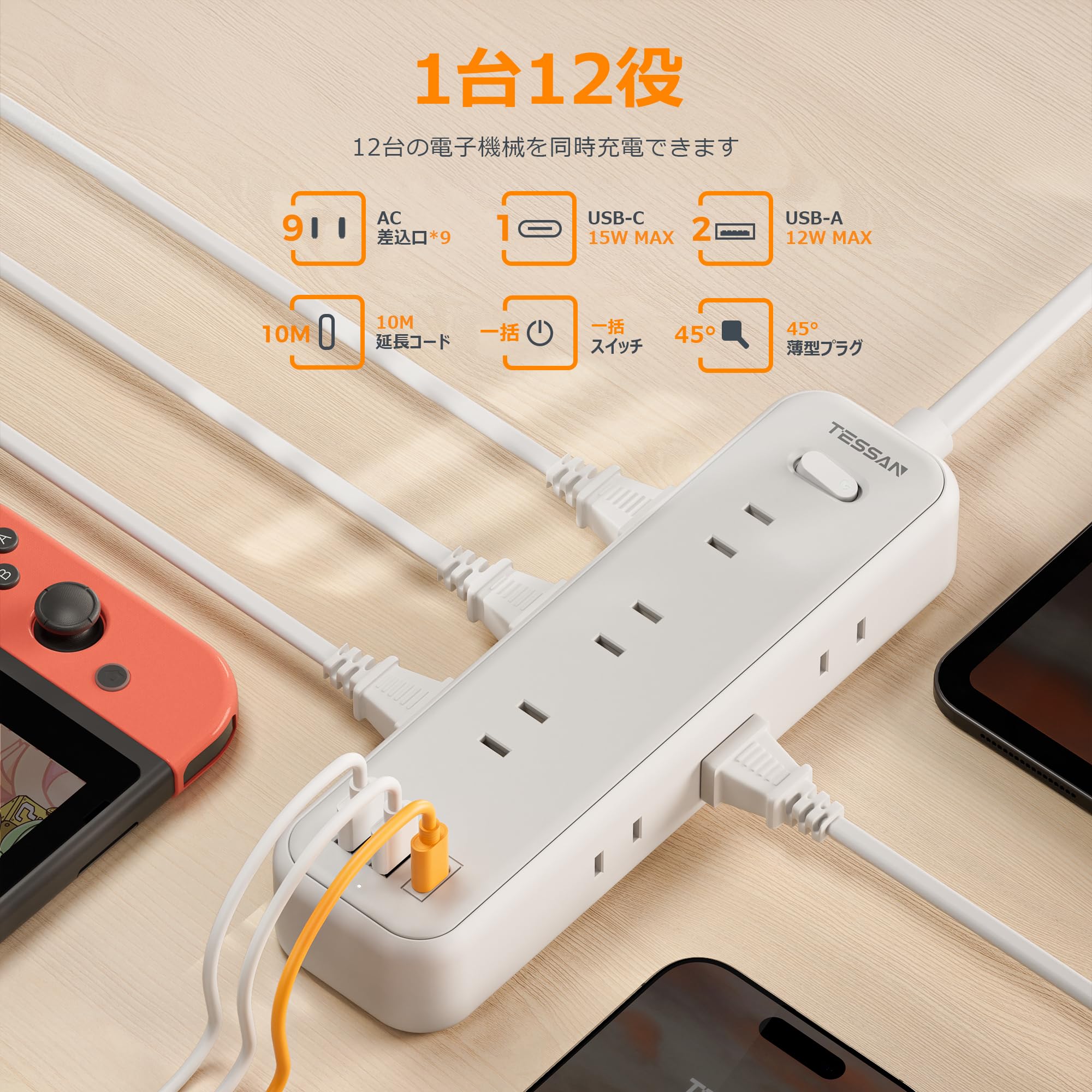 延長コード 10m 電源タップ 薄型プラグ usb たこあしコンセント テーブルタップ TESSAN 9個AC口 2個type-Aポート 1個USB-Cポート電源コード OA タコ足配線 マルチ 一括スイッチ付き 壁掛け 卓上