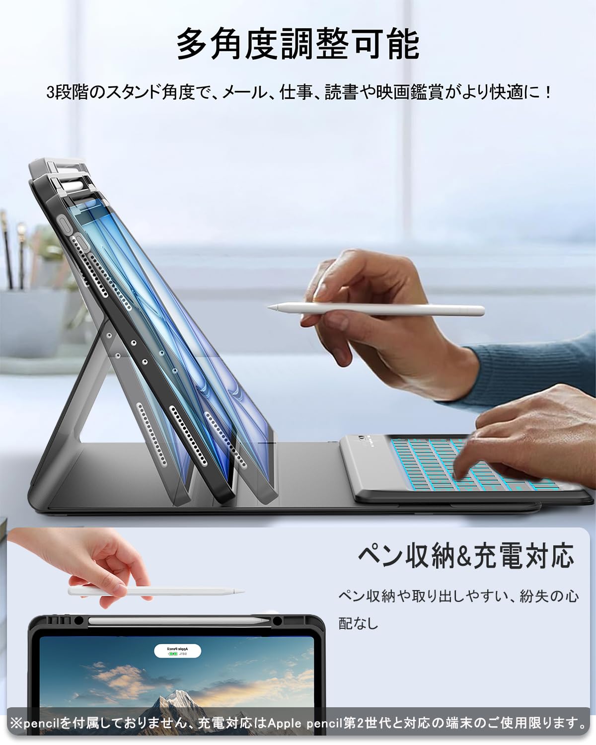 【2025 iPad Air 11 (M2 2024/M3 2025) & iPad Air 第7/6/5/4世代 キーボード付きケース 縦向き・横向き対応 10.9インチ & 11インチ iPad Pro 11 (第4/3/2/1世代) 7色バックライト 高精度トラックパッド搭載 Type-C充電 15°~180°角度調整 3台デバイス切替 ペンシルホルダー付き