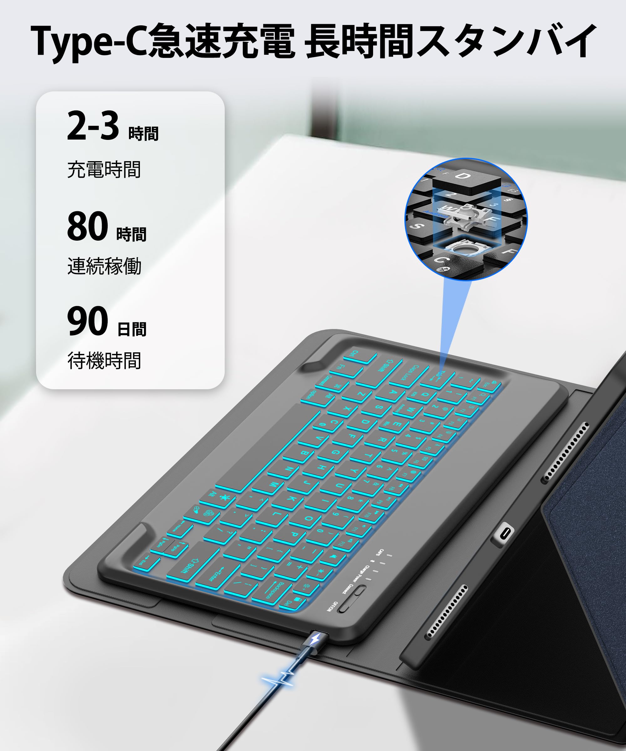 [ 2025年新開発 ]ipad A16 11世代& ipad 10世代キーボード 7色バックライト11インチ/10.9インチ あいぱっど第10世代 キーボードケース 脱着式 ペン収納 Type-C充電式 耐衝撃 全面保護 多角度調整 耐久性 US配列 日本語説明書付き ブルー