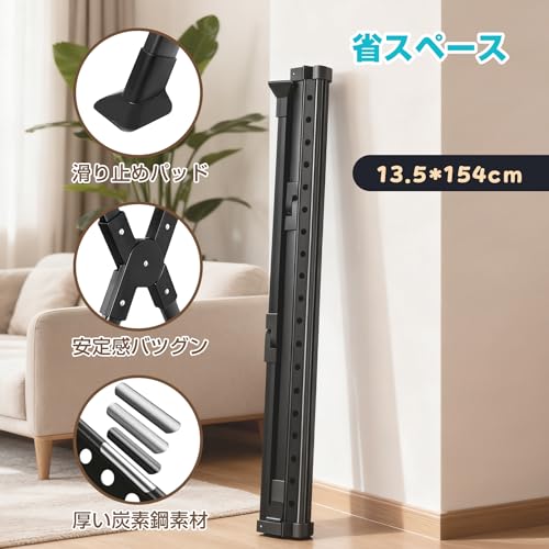 RUB 突っ張り室内物干しポール 簡単ワンタッチ取付 室内物干し つっぱり式 物干しポール ハンガーアーム 洗濯物干し 簡単組み立て ハンガー掛け 高さ110~310cm (ブラック, 6段ハンガー掛け)