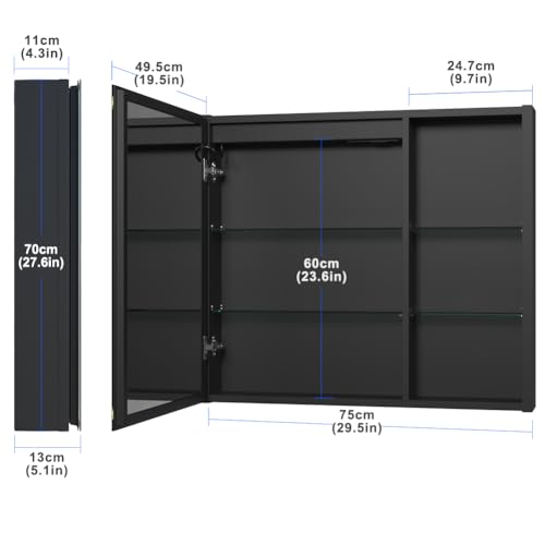 KWW LEDライト付きバスルーム薬キャビネットソケット&USB、曇り止め、調光可能、3色ライトメイクアップミラー、取り付け簡単、壁掛けキャビネット (75.1 x 70 cm)