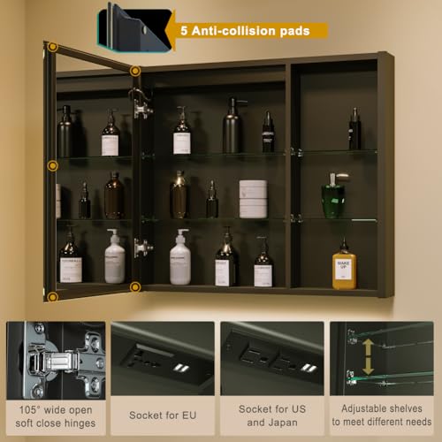KWW LEDライト付きバスルーム薬キャビネットソケット&USB、曇り止め、調光可能、3色ライトメイクアップミラー、取り付け簡単、壁掛けキャビネット