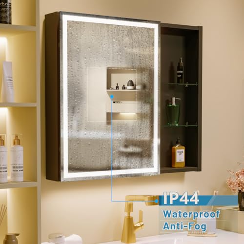 KWW LEDライト付きバスルーム薬キャビネット、曇り止め、調光可能、3色ライトメイクアップミラー、コンセント&USB、取り付け簡単、壁掛けミラーキャビネット