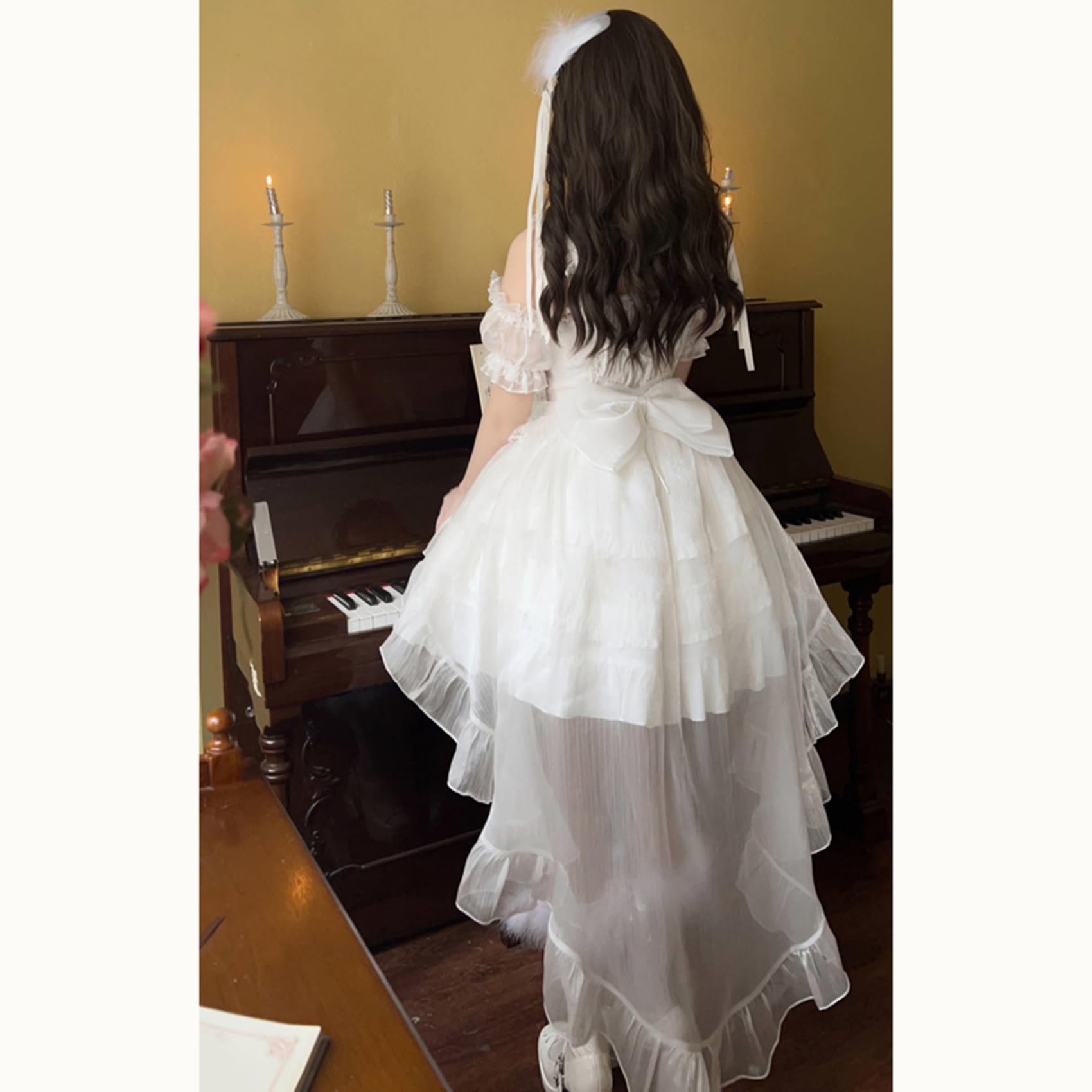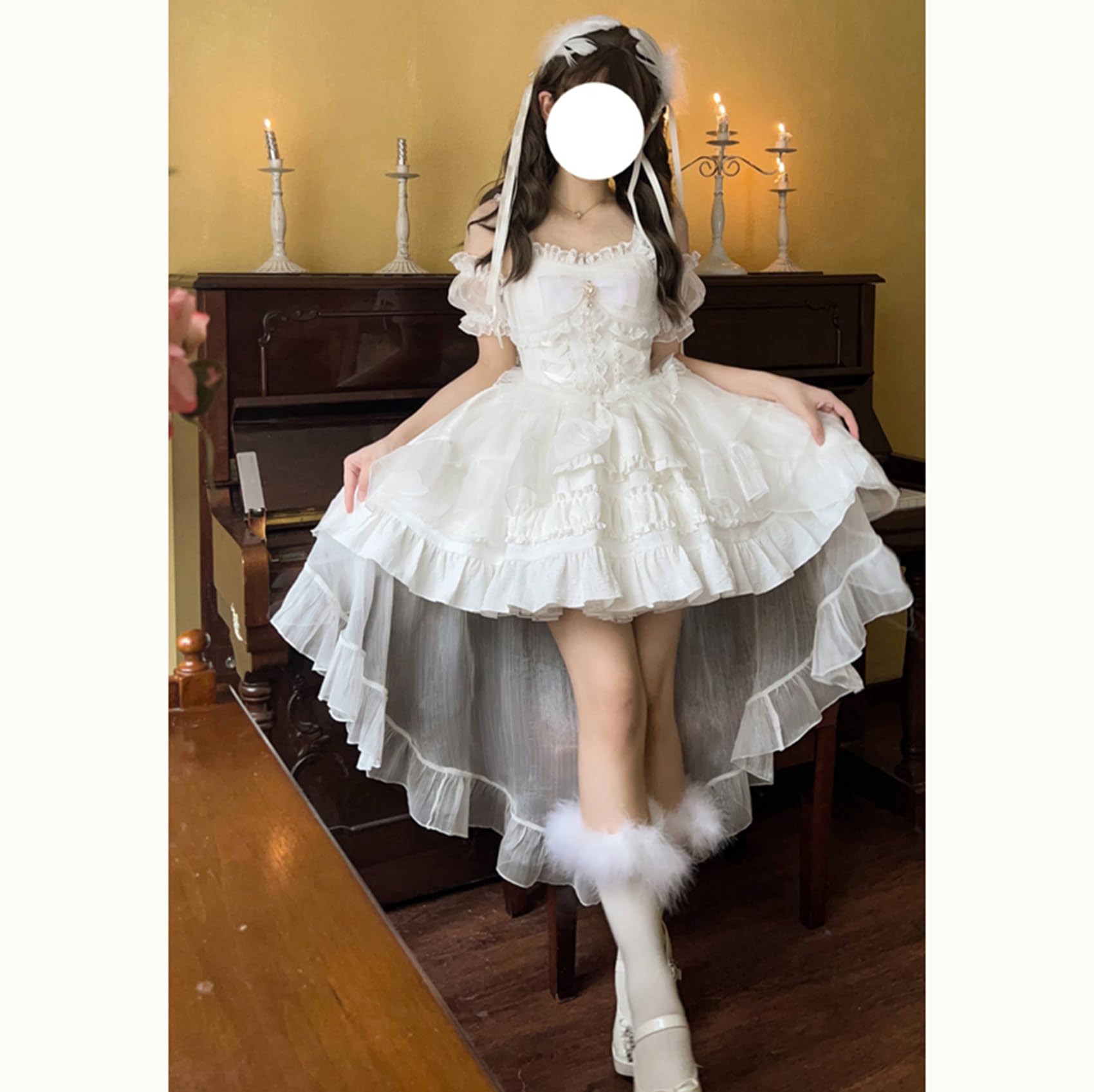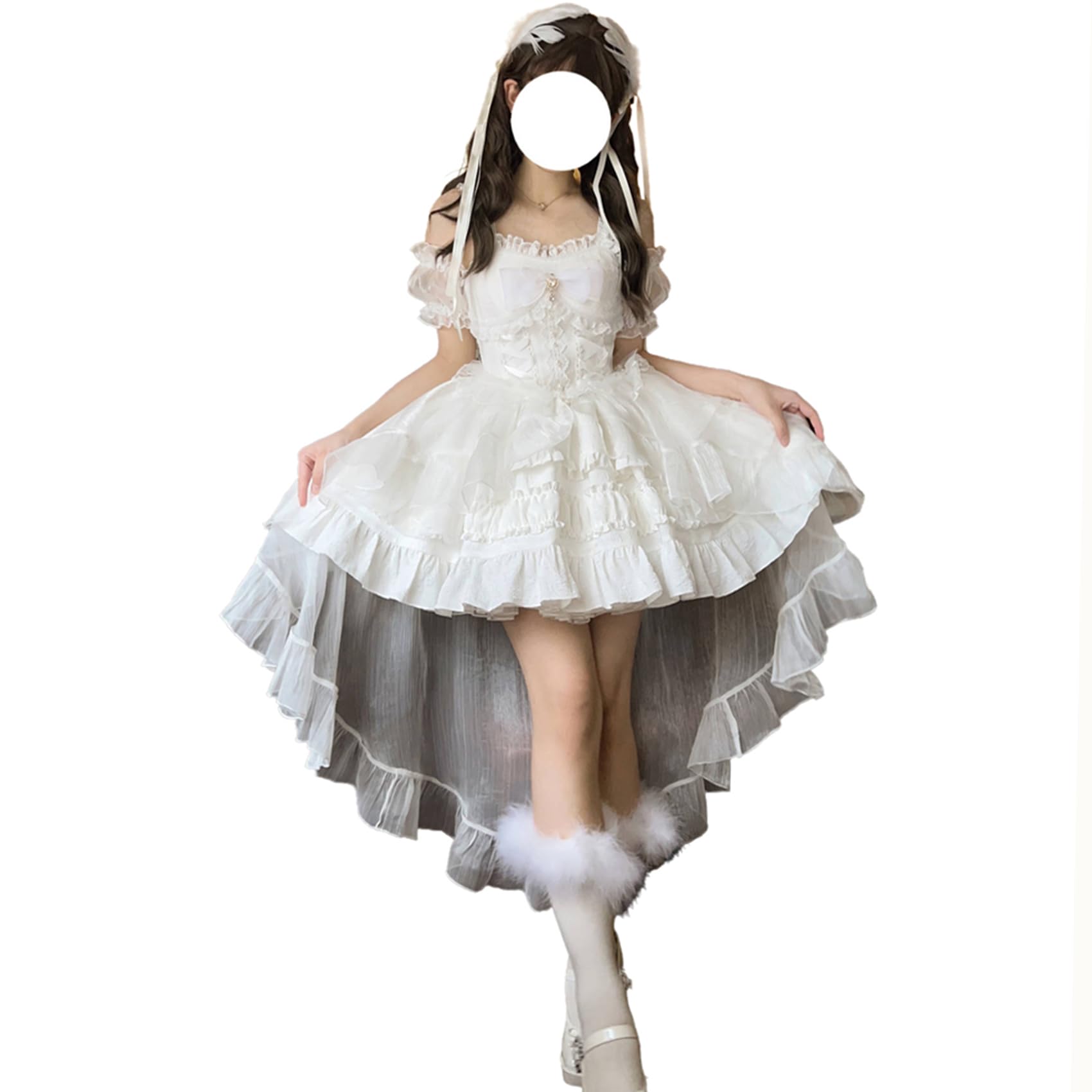 [ボズとガルヤ] ロリータ ティアードワンピース オフショルダー 長い裾 コスプレ衣装 チュール 透け感 フリル 白 黒 ピンク 水色 赤 半袖 ゆめかわいい cosplay lolita ハロウィン仮装