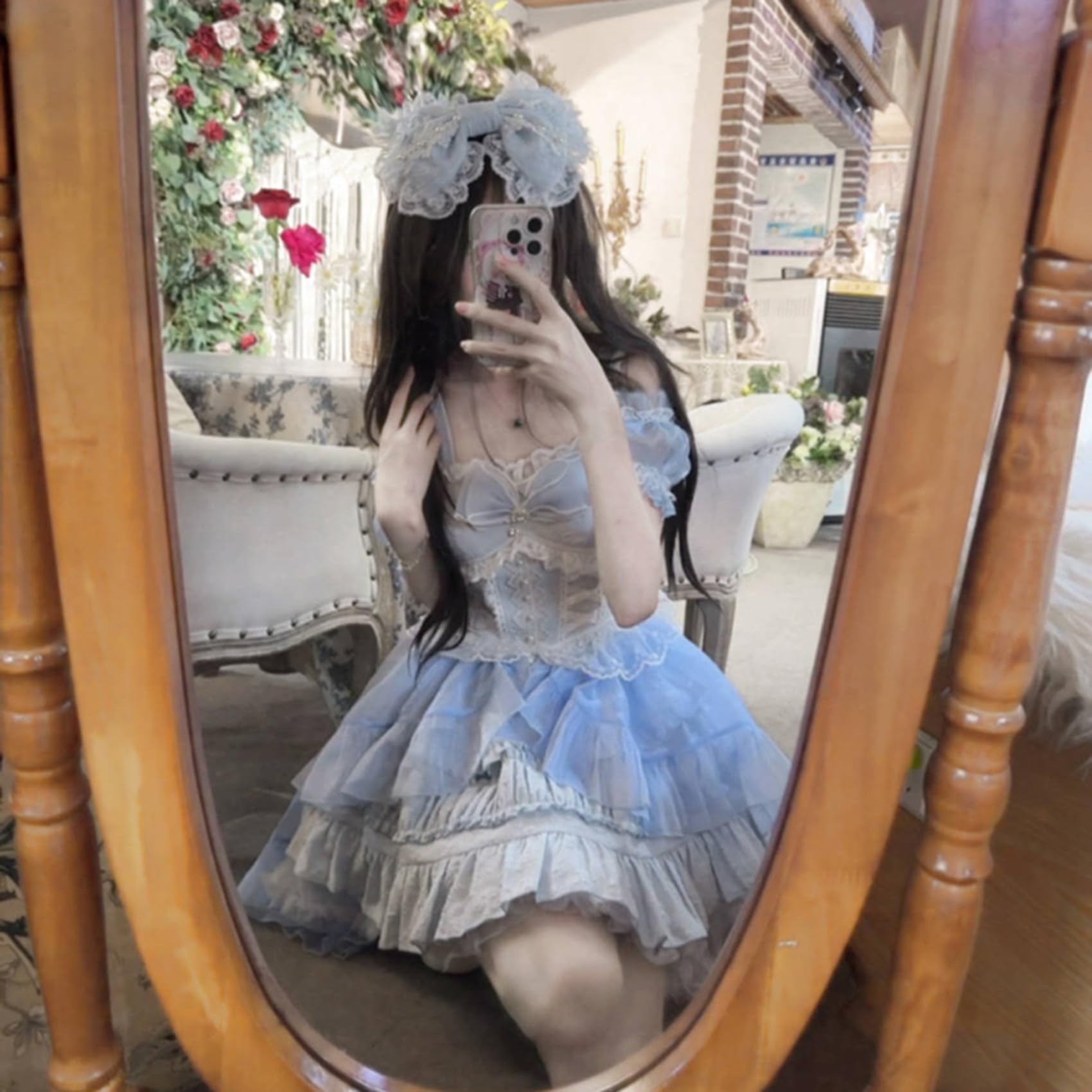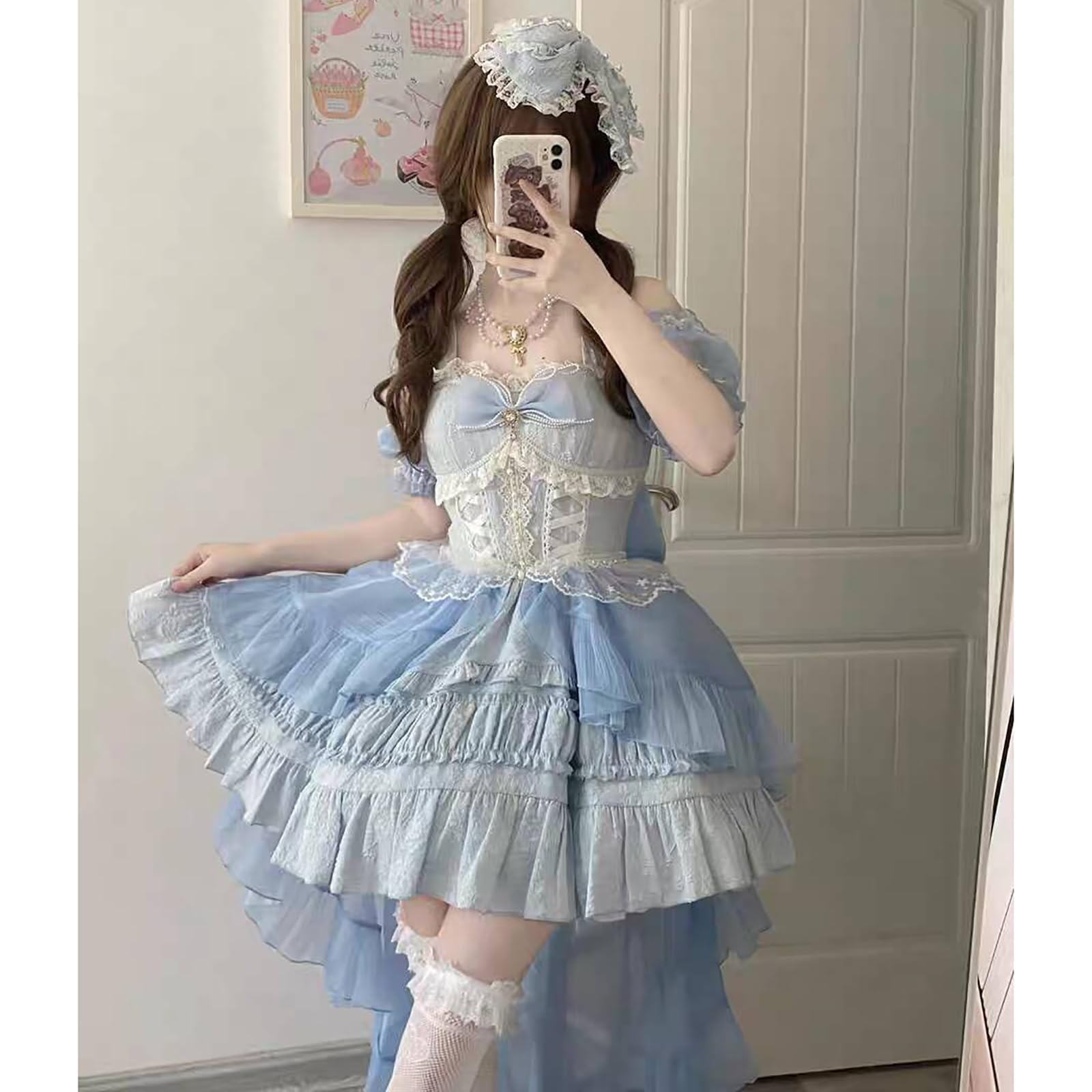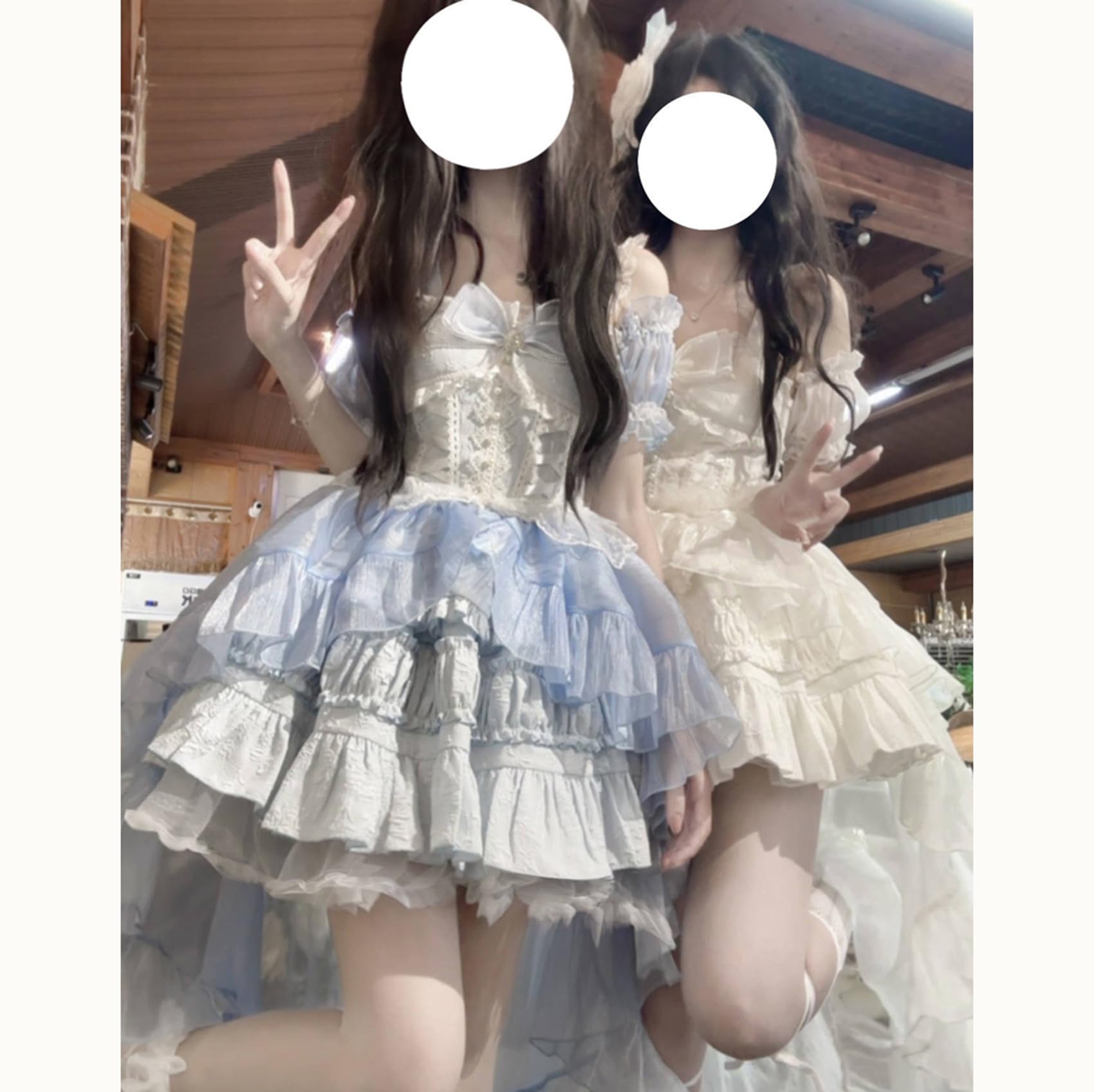 [ボズとガルヤ] ロリータ ティアードワンピース オフショルダー 長い裾 コスプレ衣装 チュール 透け感 フリル 白 黒 ピンク 水色 赤 半袖 ゆめかわいい cosplay lolita ハロウィン仮装