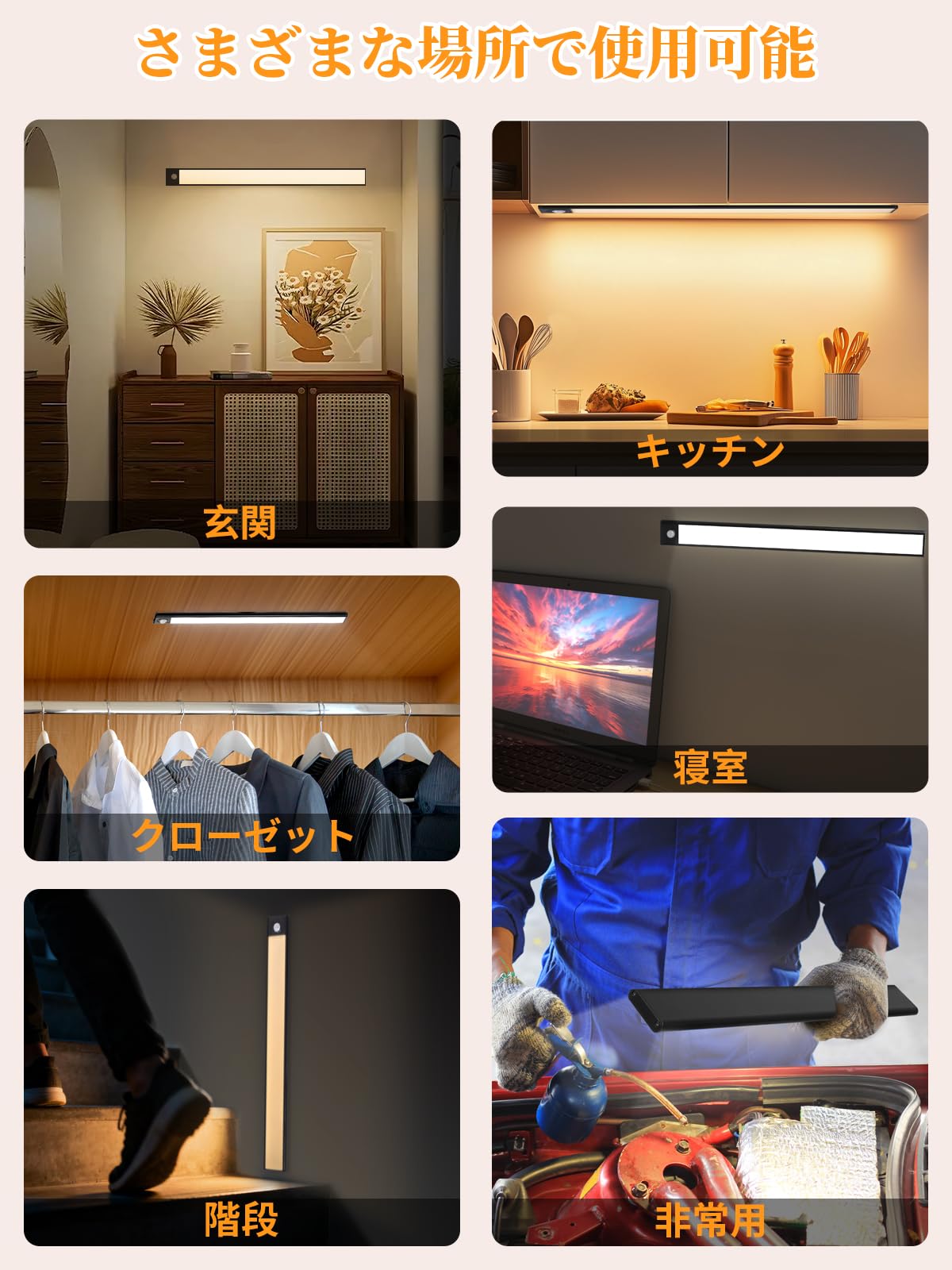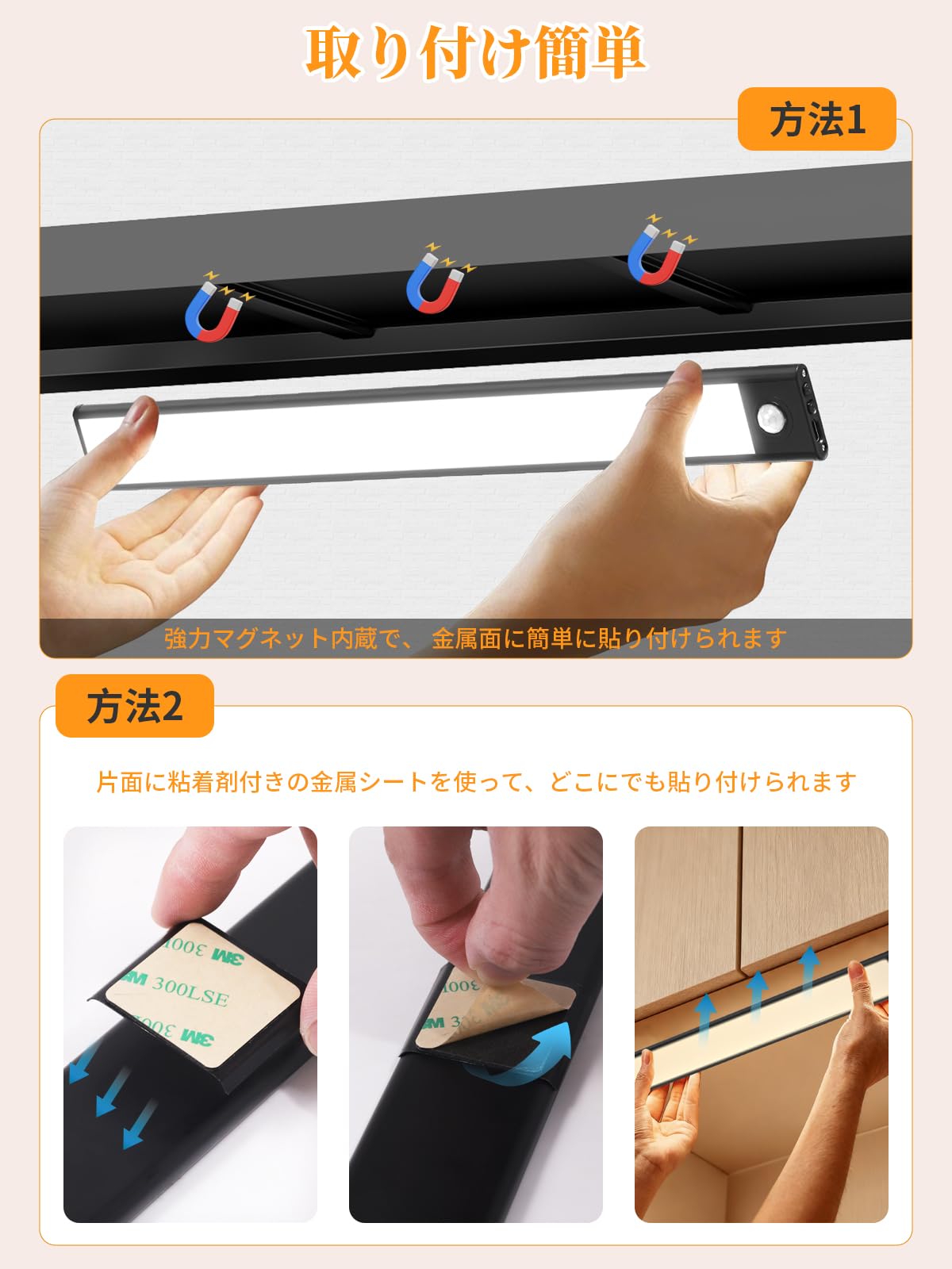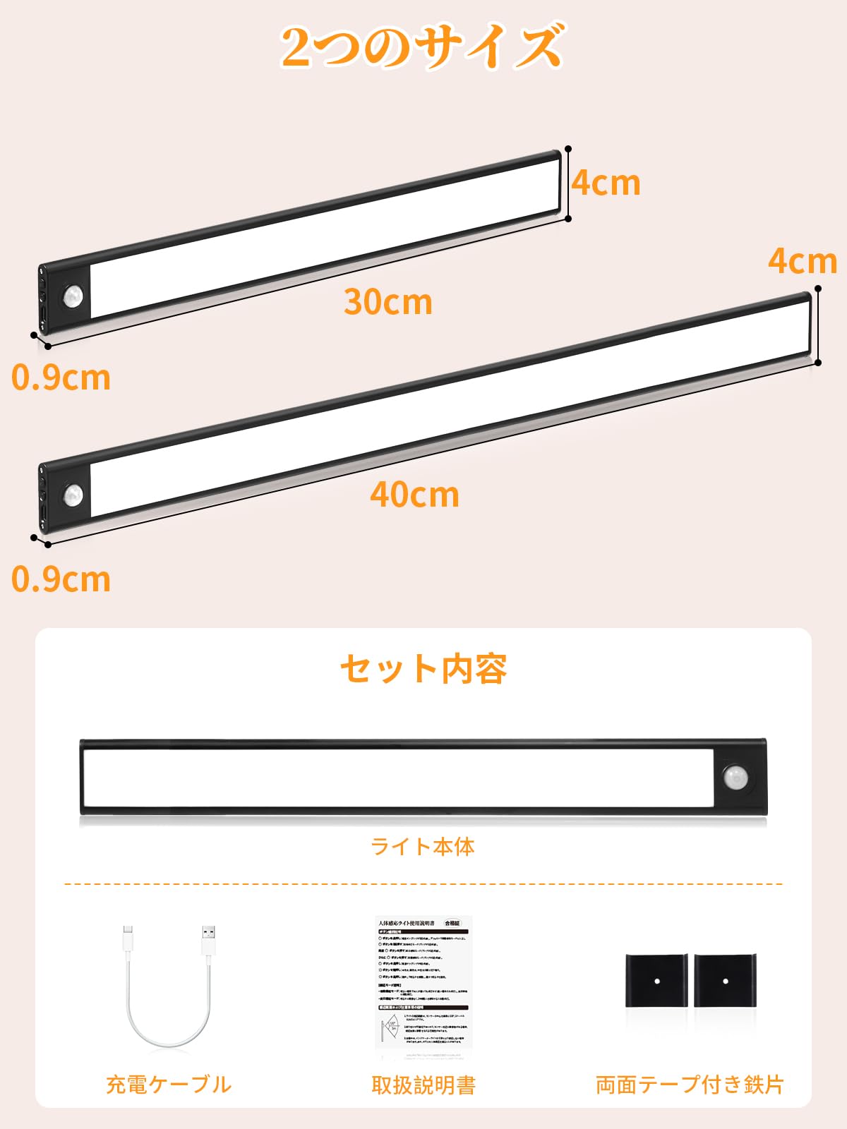 HAIKUSOUBI 人感センサーライト LEDライト 40cm 室内 バーライト 明暗センサー USB充電式 三段階調色(白色、昼白色、電球色) 無段階調光 磁石式 小型 120°感知角度 取付簡単