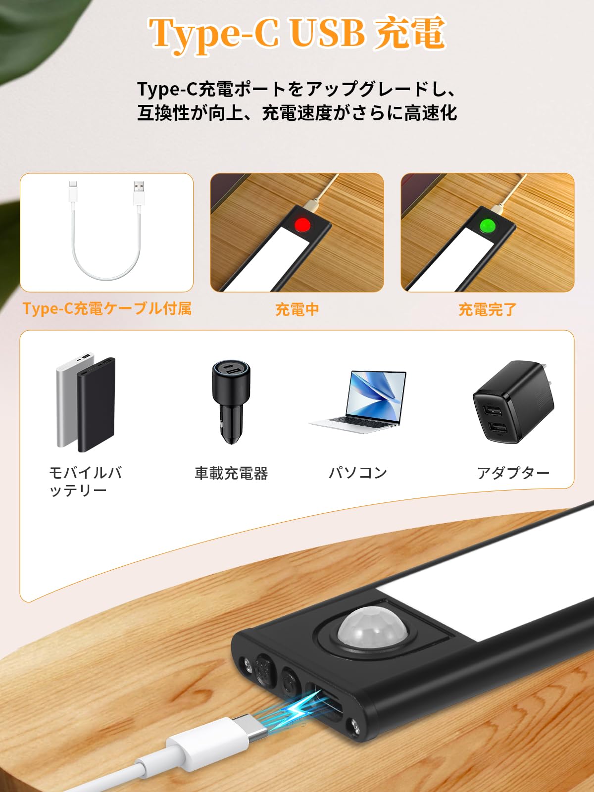 人感センサーライト 室内 充電式 マグネット ledライトバー LEDバーライト 読書灯 棚下ライト Type-C 無段階調光 キッチン用 屋内 寝室 廊下 階段 玄関 階段 30cm 1個入り ブラック