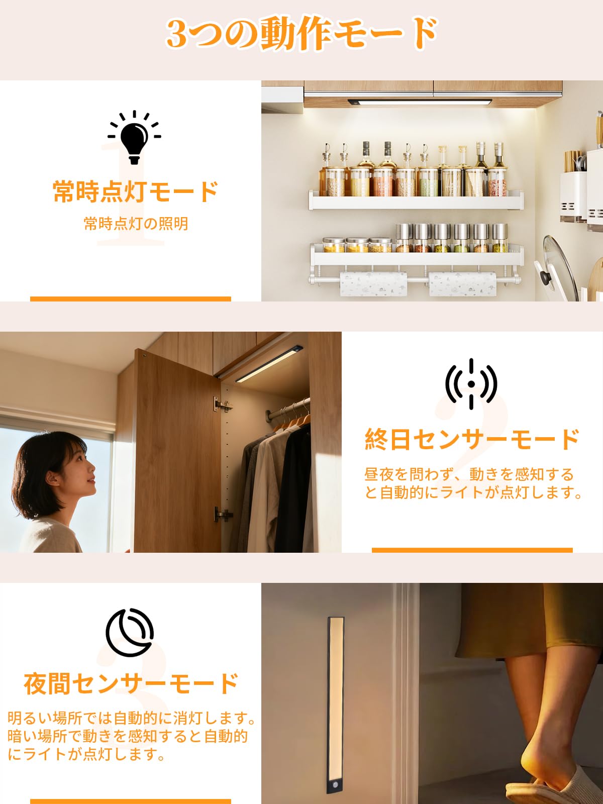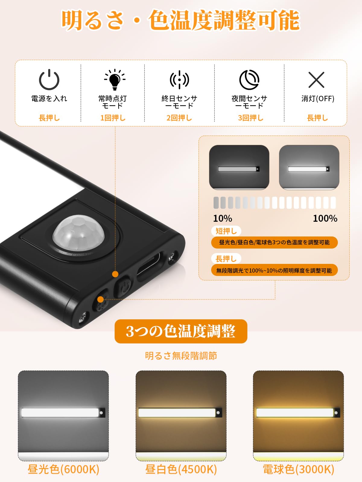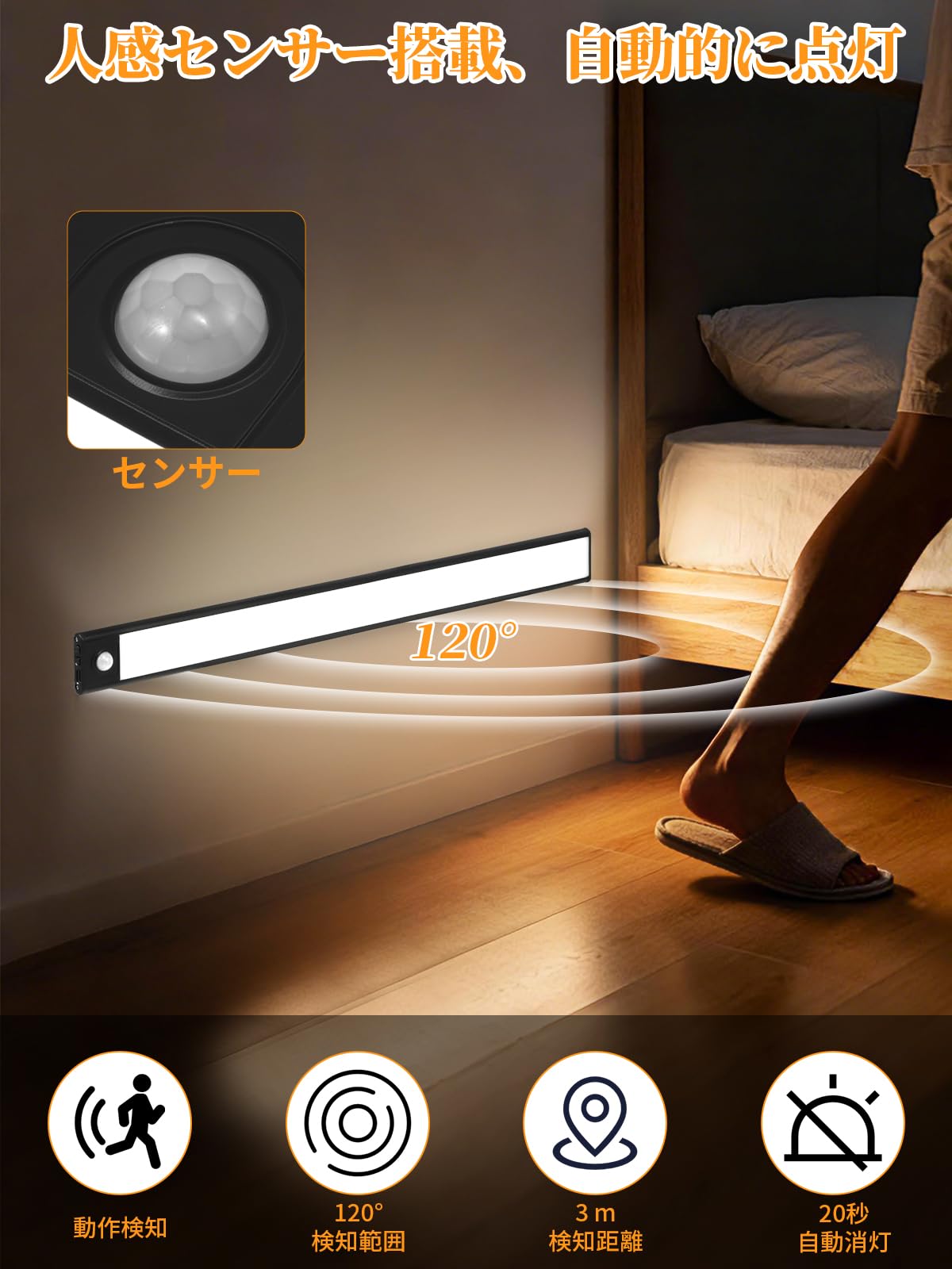 ledセンサーライト 人感センサー 室内 3色調整可能 人感センサーライト 室内 usb充電式 電池式 1500mAH 大容量電池 昼光色 昼白色 電球色 無段階調節 高感度 高輝度 足元灯 クローゼット ライト 超寿命 3本入30cm