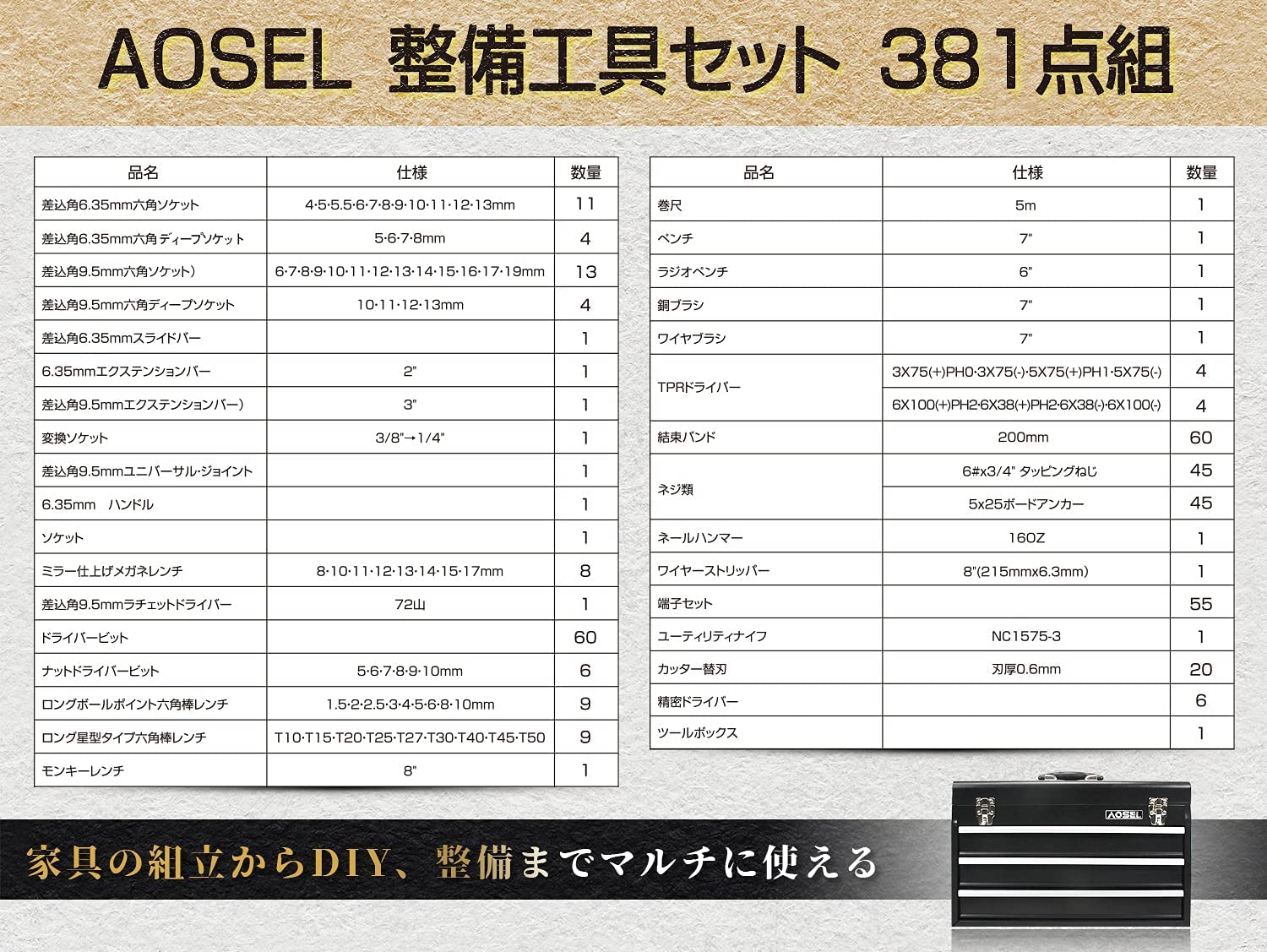 整備工具セット 381点組 ホームツールセット DIY用 バイク・自動車メンテナンス用 家具の組み立て 日曜大工 作業工具 収納ケース付き