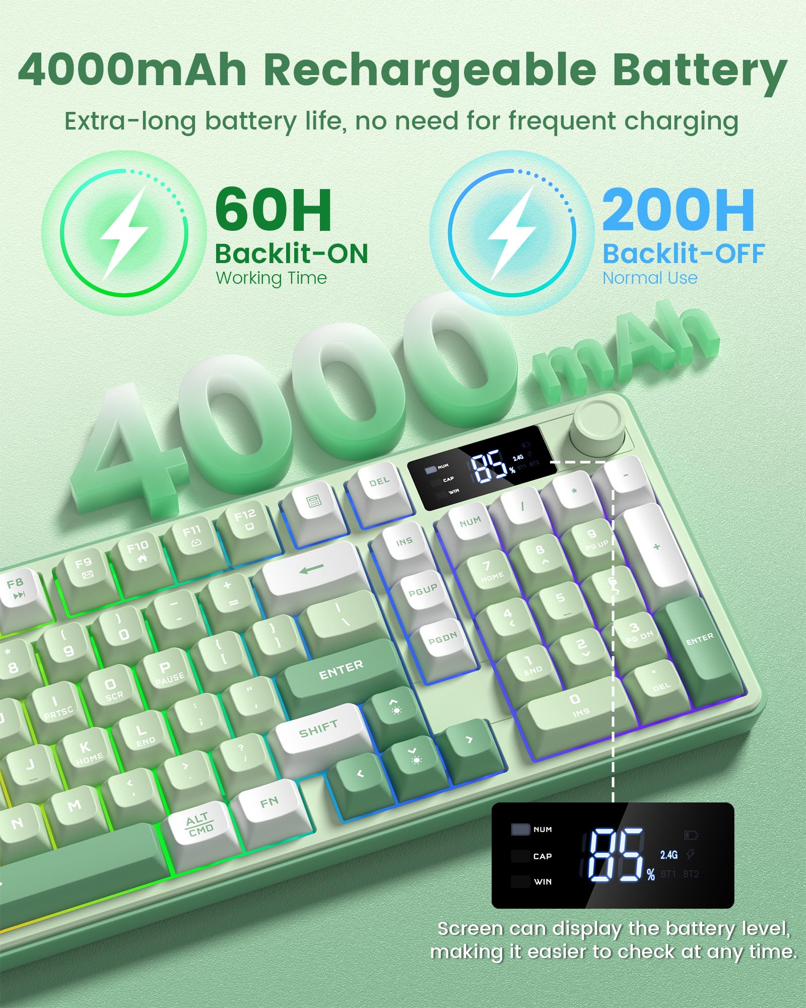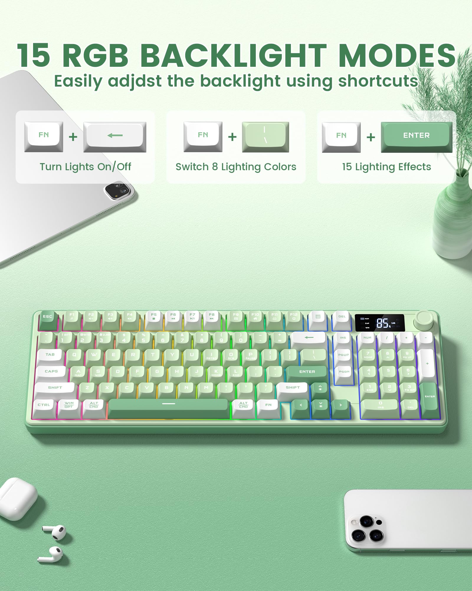 Womier 98キーワイヤレスゲーミングキーボード、Bluetooth対応、テンキーパッド付き、RGBバックライト、トライモード BT/2.4GHz/USB-C、クリーミーカラー (グリーン)