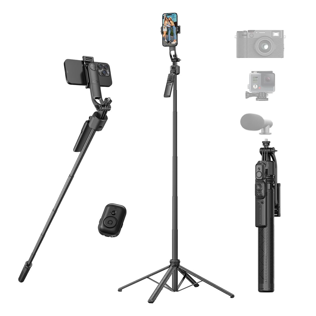 K&F CONCEPT 自撮り棒 スマホ 三脚 Magasfe対応 【2025年新型・マグネット式とクリップ式の2in1】 超長180cm 自動開閉 セルカ棒 4軸ジョイント 360°回転 折りたたみ 軽量 伸縮 スマホ用 充電式リモコン 1/4ネジ付き じどり棒 iPhone 17 Pro MAX 16 15 14 13 12 & Android対応