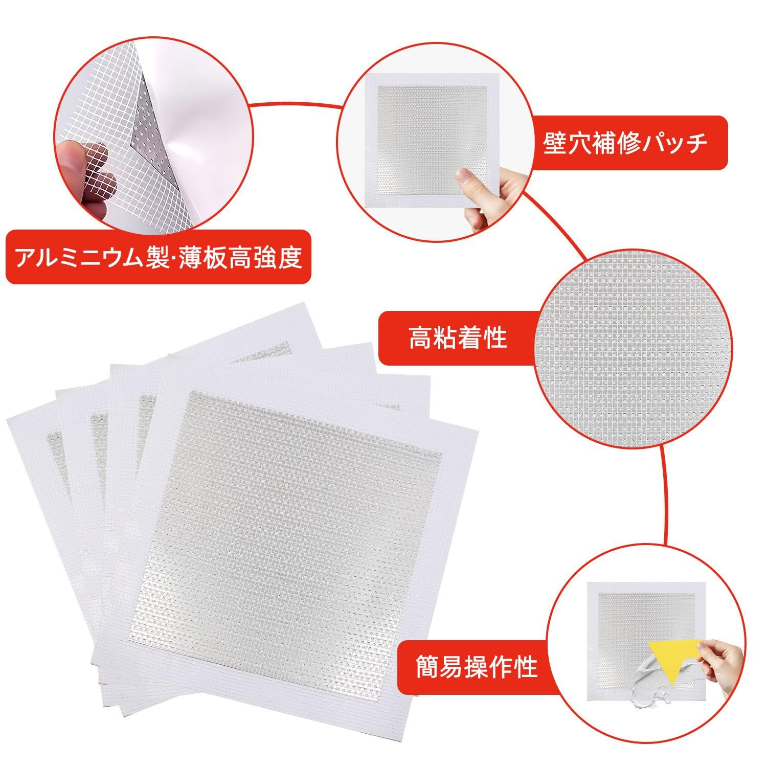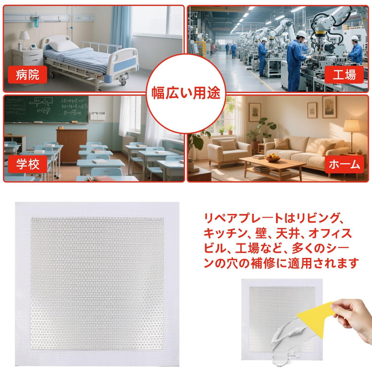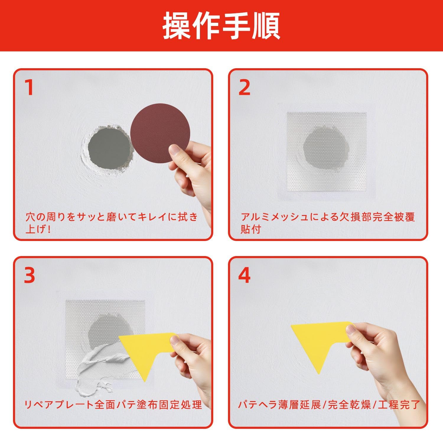 リペアプレート 壁穴補修キット 4枚セット 壁 穴埋め 15×15cm(アルミ板10×10cm) 石膏ボード 壁 穴 補修 壁穴埋め補修 壁の穴埋め サンドペーパー (2種類) 使い捨て手袋 パテベラ付き 壁補修