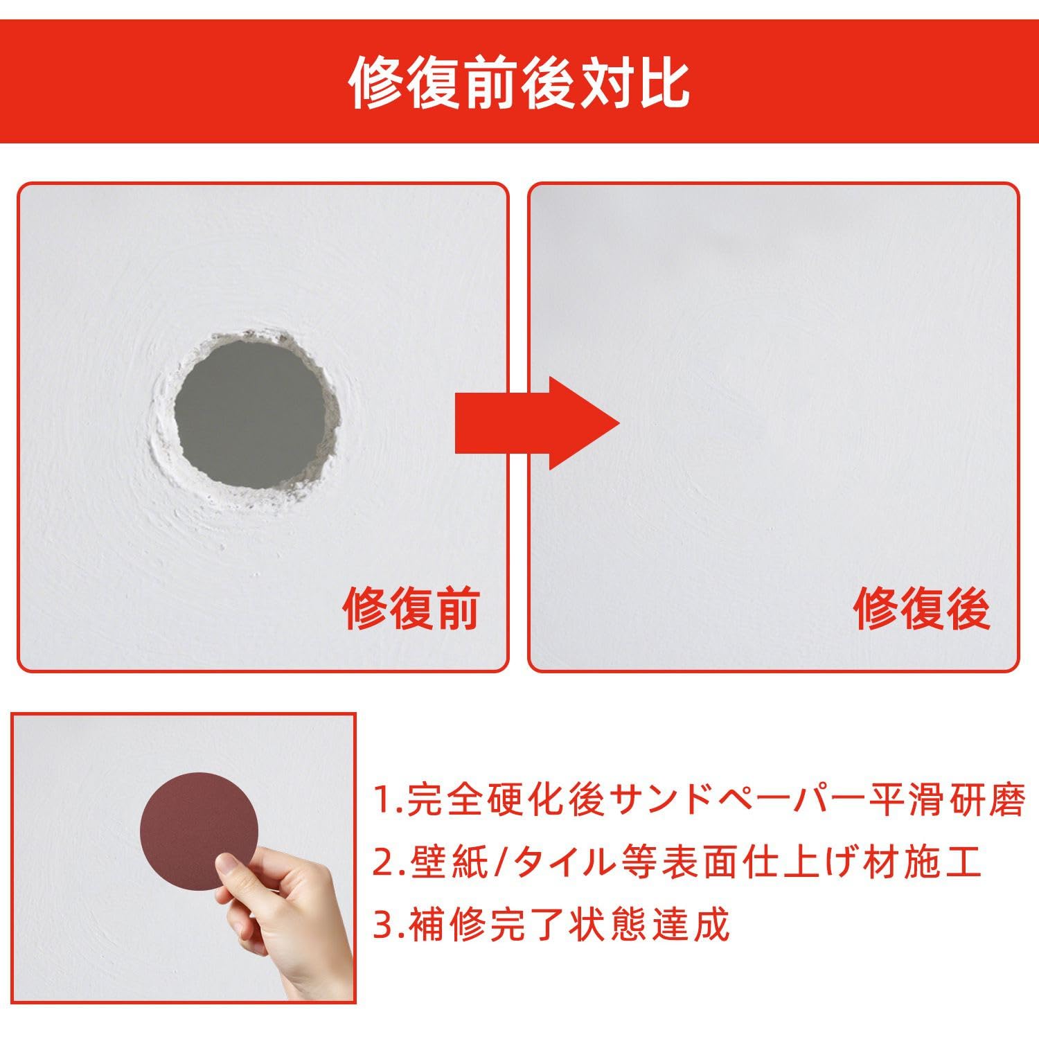 壁穴補修キット リペアプレート 2枚セット 壁 穴埋め 15×15cm(アルミ板10×10cm) 石膏ボード 壁 穴 補修 壁穴埋め補修 サンドペーパー (2種類) パテベラ付き